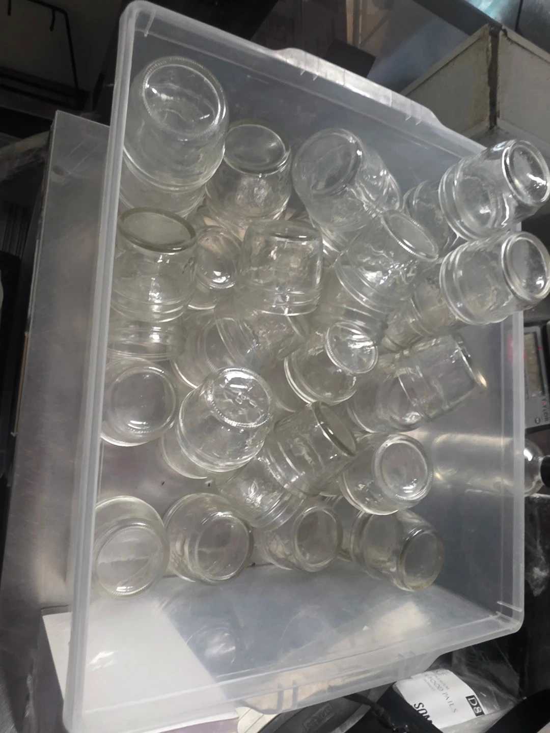 Selling a bunch of small clear glass jars. They're perfect for storing spices, small items, or for crafting projects. They are in good condition.