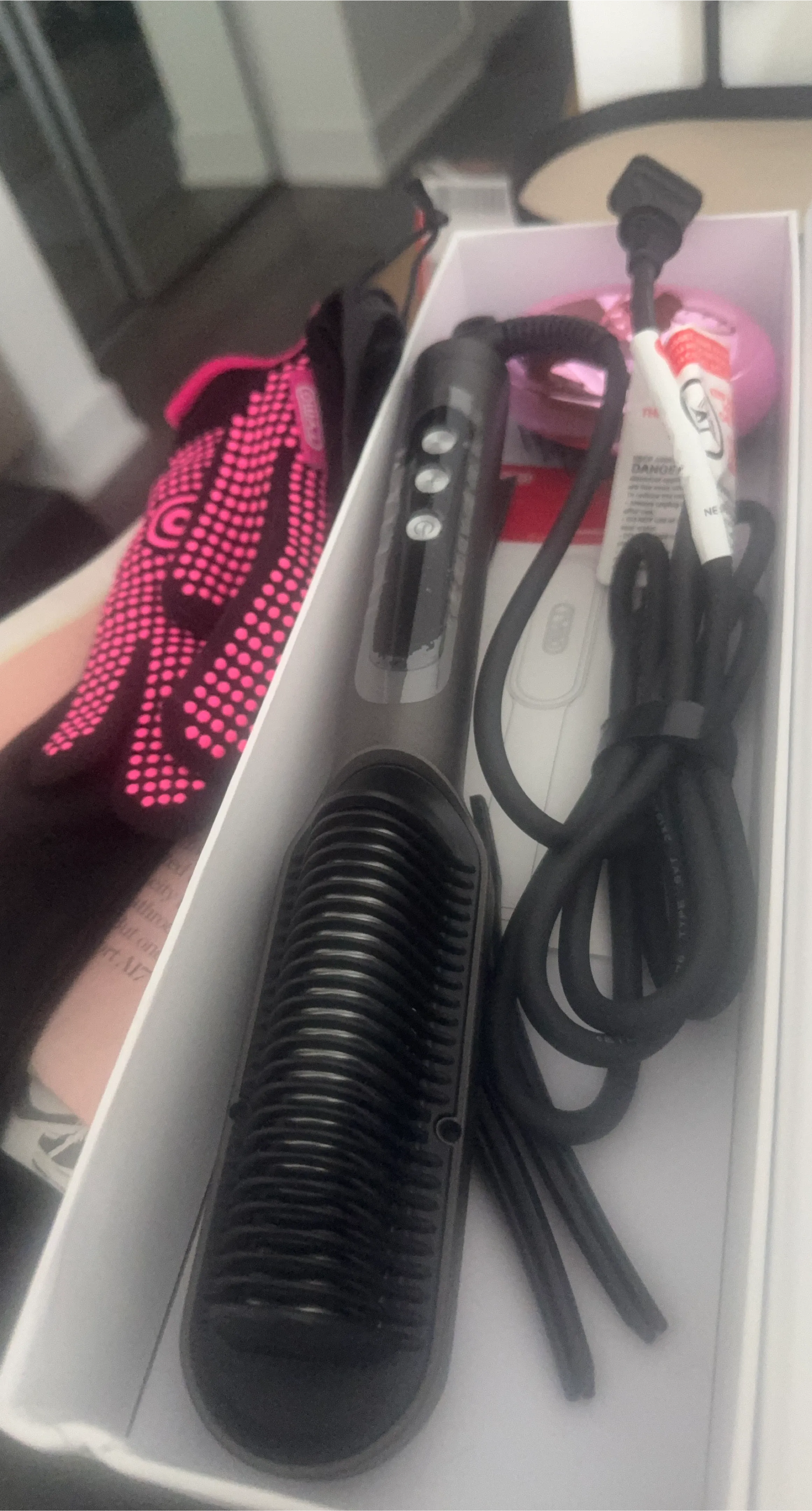 Selling a TYMO hair straightener brush. It comes with the box and all included accessories, such as the heat-resistant glove, hair clips, and carrying pouch. It's in great condition and ready to use!
