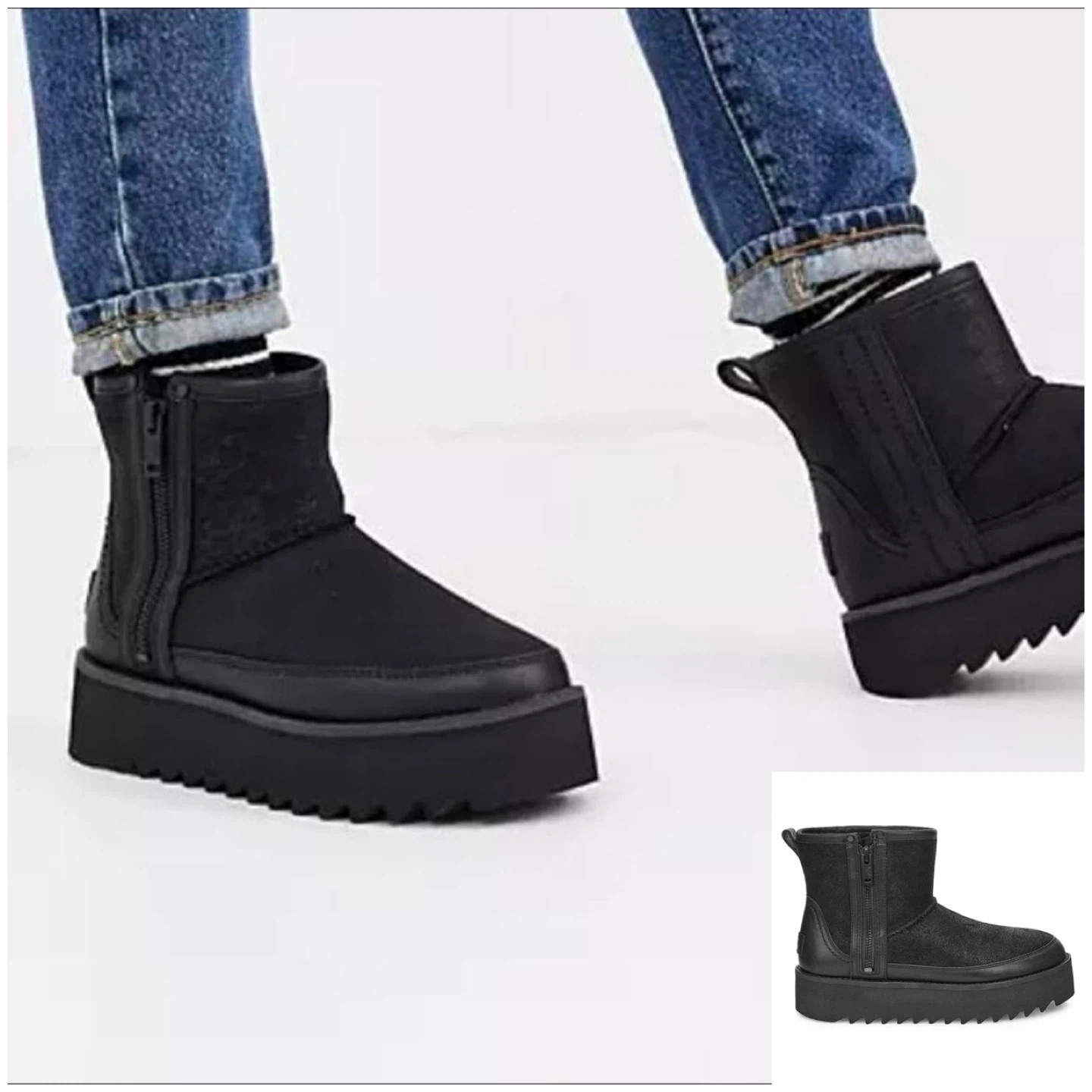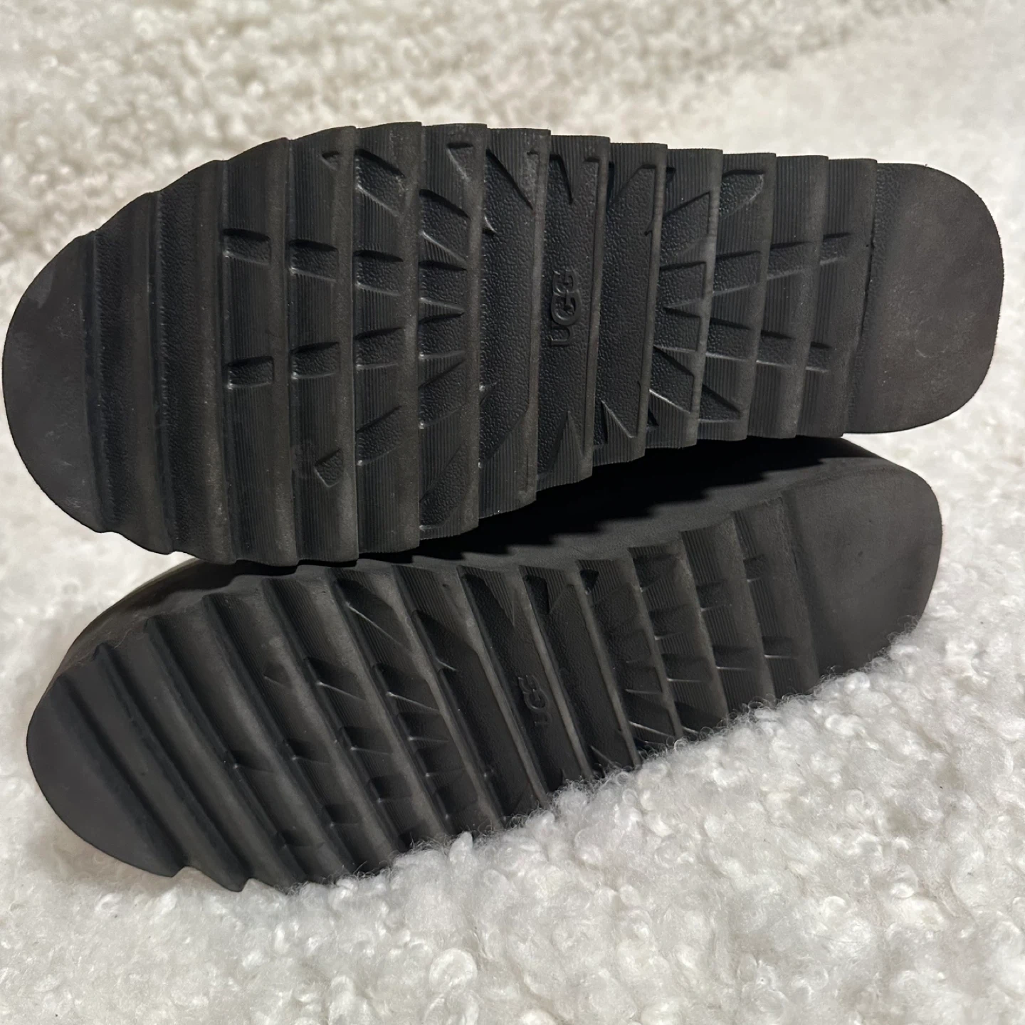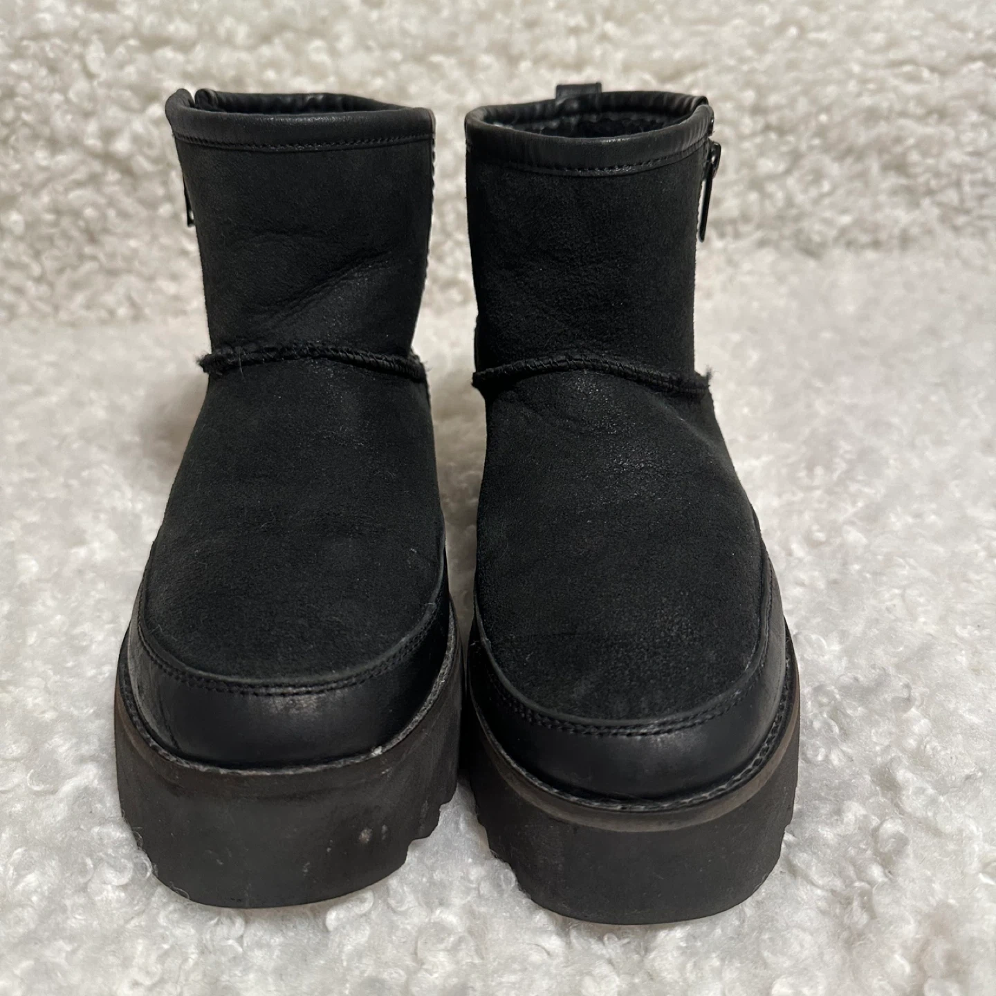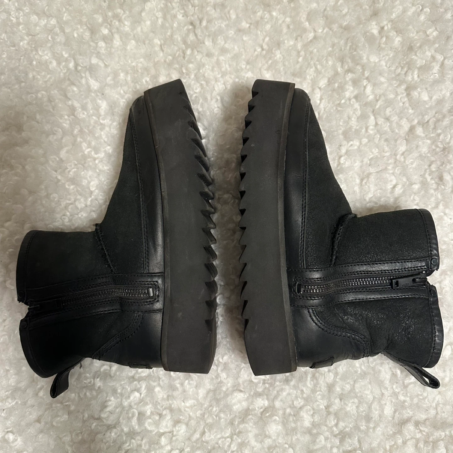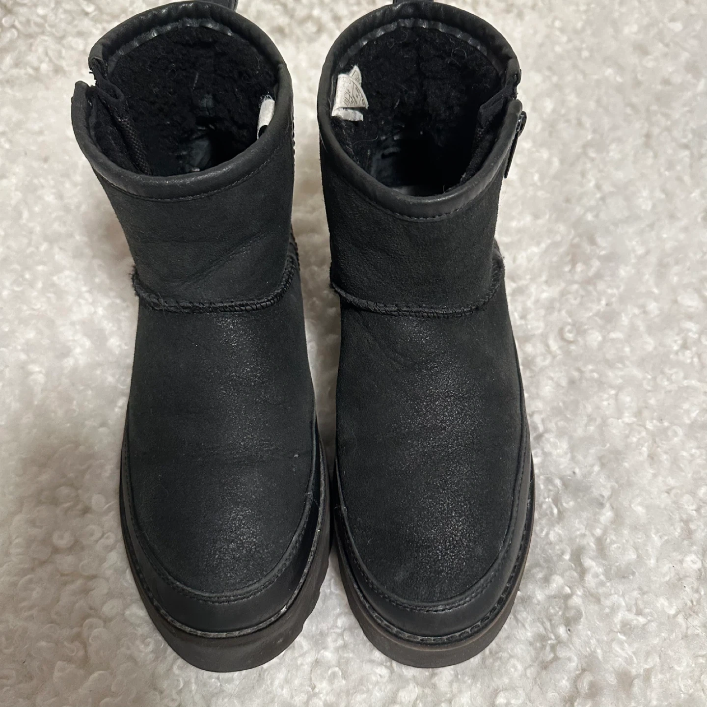 These UGG ankle boots are in great condition and ready for a new owner! They feature a stylish platform sole and a convenient side zipper. The boots are made of black leather, making them a versatile addition to any wardrobe