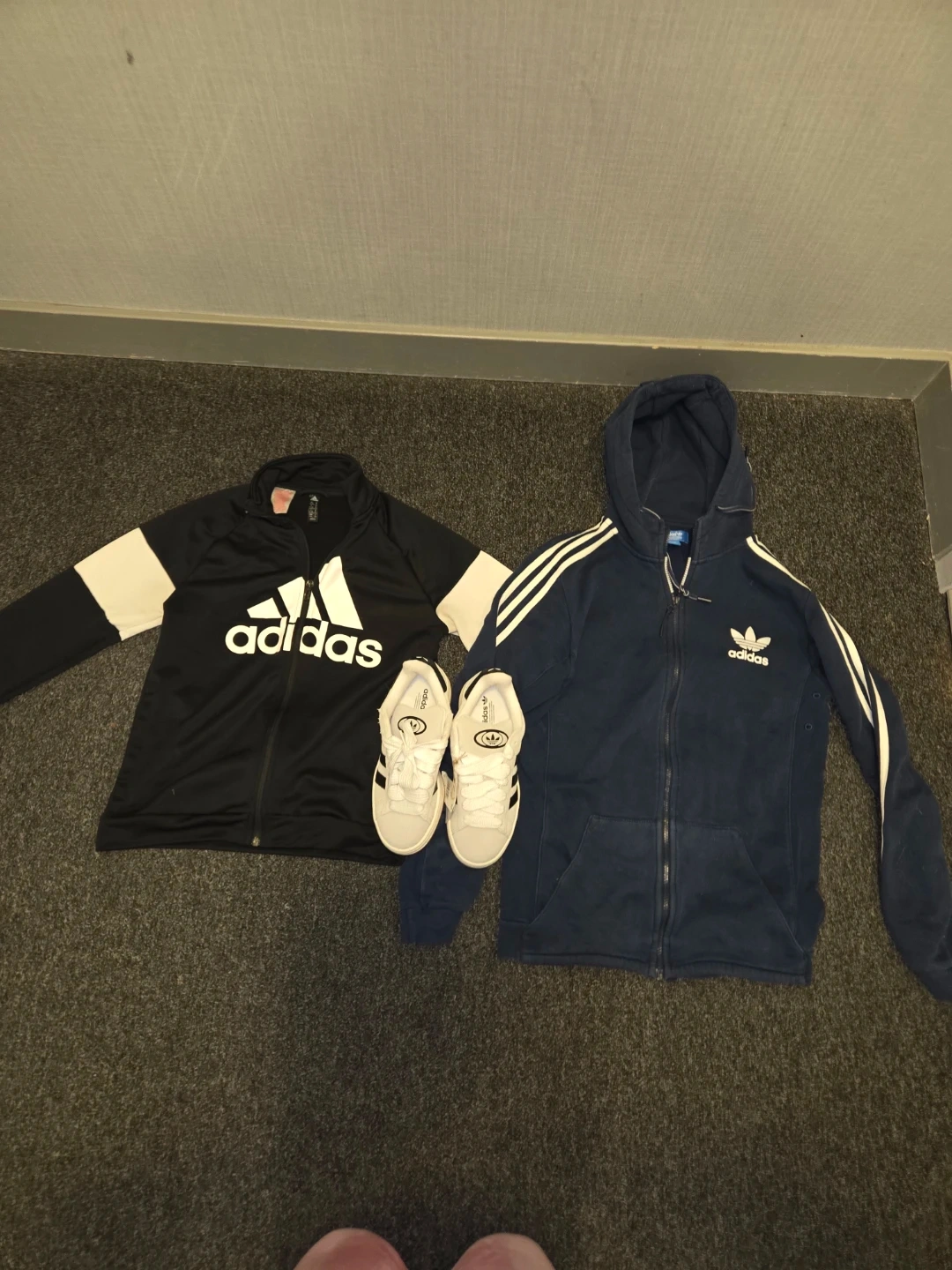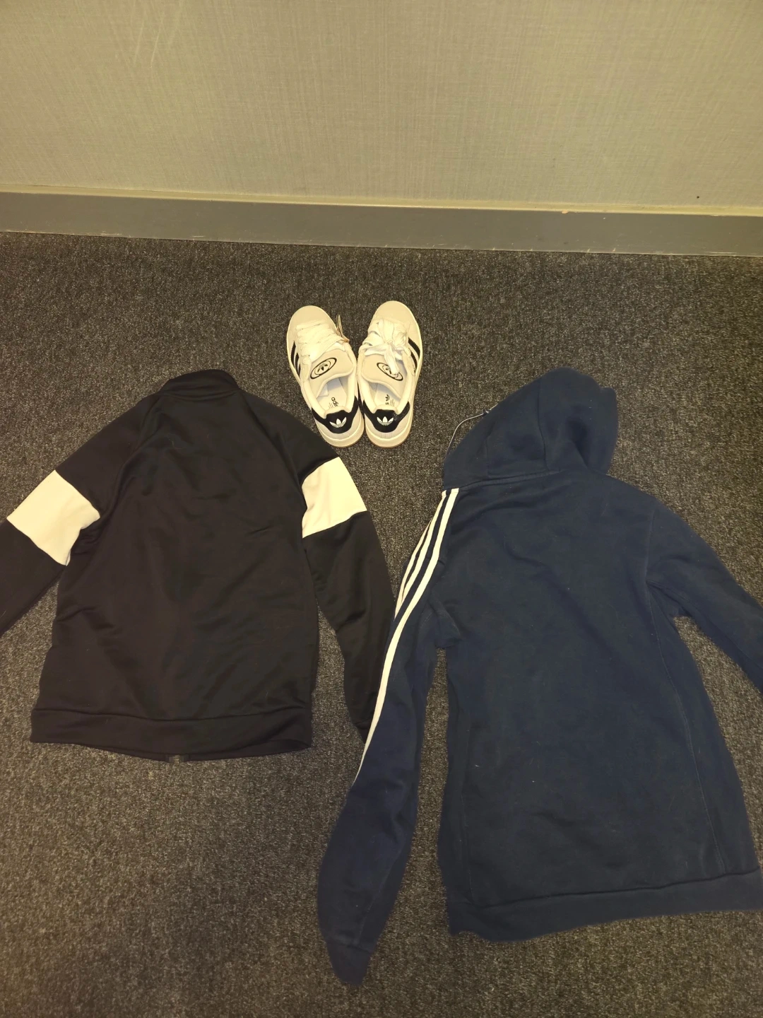 Selling a pair of Adidas Campus 00s shoes, size US 6.5, along with two Adidas Sweaters. One Sweater is black with white accents, and the other is navy blue with the classic three stripes. Both jackets are size M/M (CDN). Great for active people.