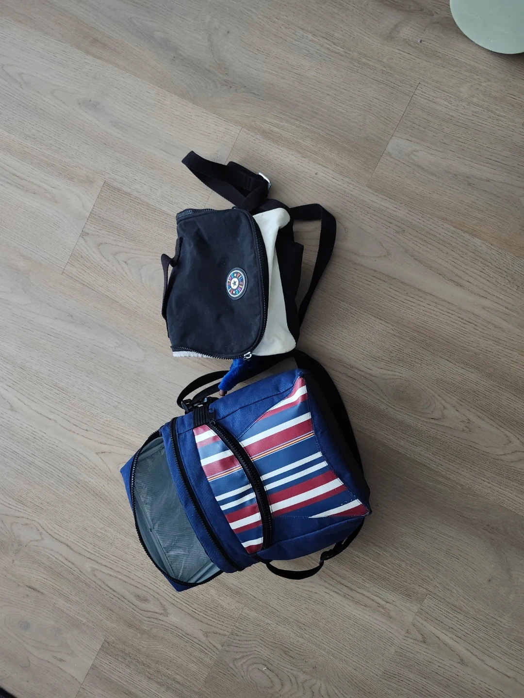 Two Kipling lunch bags for sale! One is blue with red and white stripes, and the other is black and white. Both are in great shape and ready for a new owner