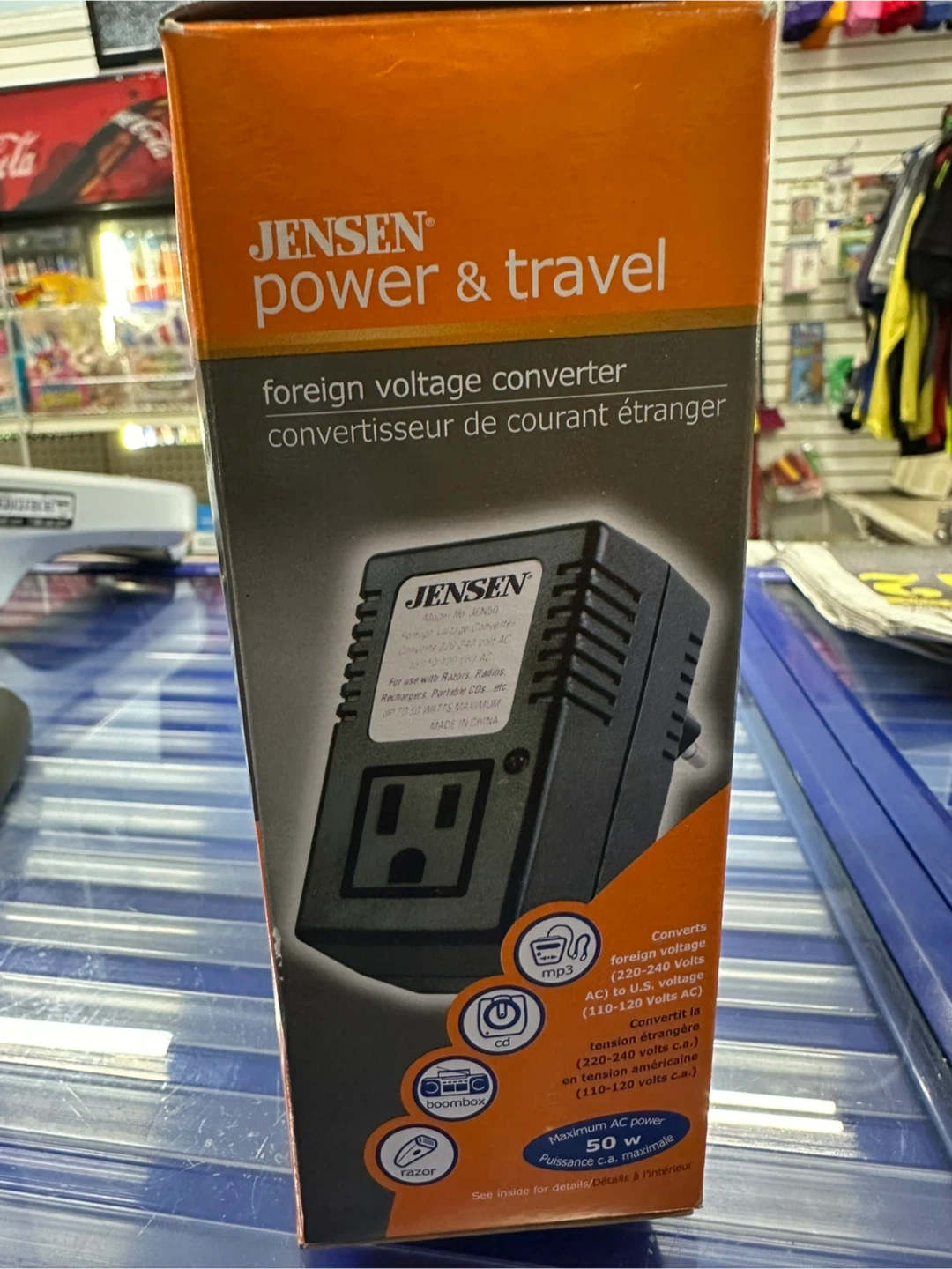 Selling a Jensen Power & Travel foreign voltage converter. It converts foreign voltage (220-240 Volts AC) to U.S. voltage (110-120 Volts AC). It is suitable for use with razors, radios, and portable CDs, up to 50 Watts maximum. The box is included!