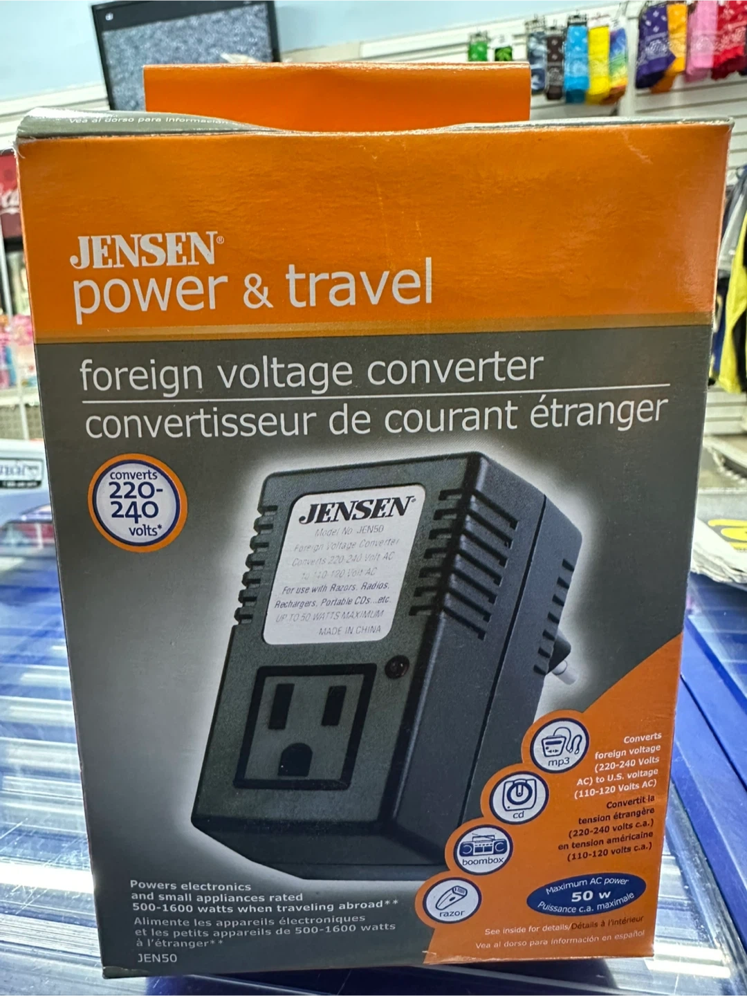 Selling a Jensen Power & Travel foreign voltage converter. It converts foreign voltage (220-240 Volts AC) to U.S. voltage (110-120 Volts AC). It is suitable for use with razors, radios, and portable CDs, up to 50 Watts maximum. The box is included!