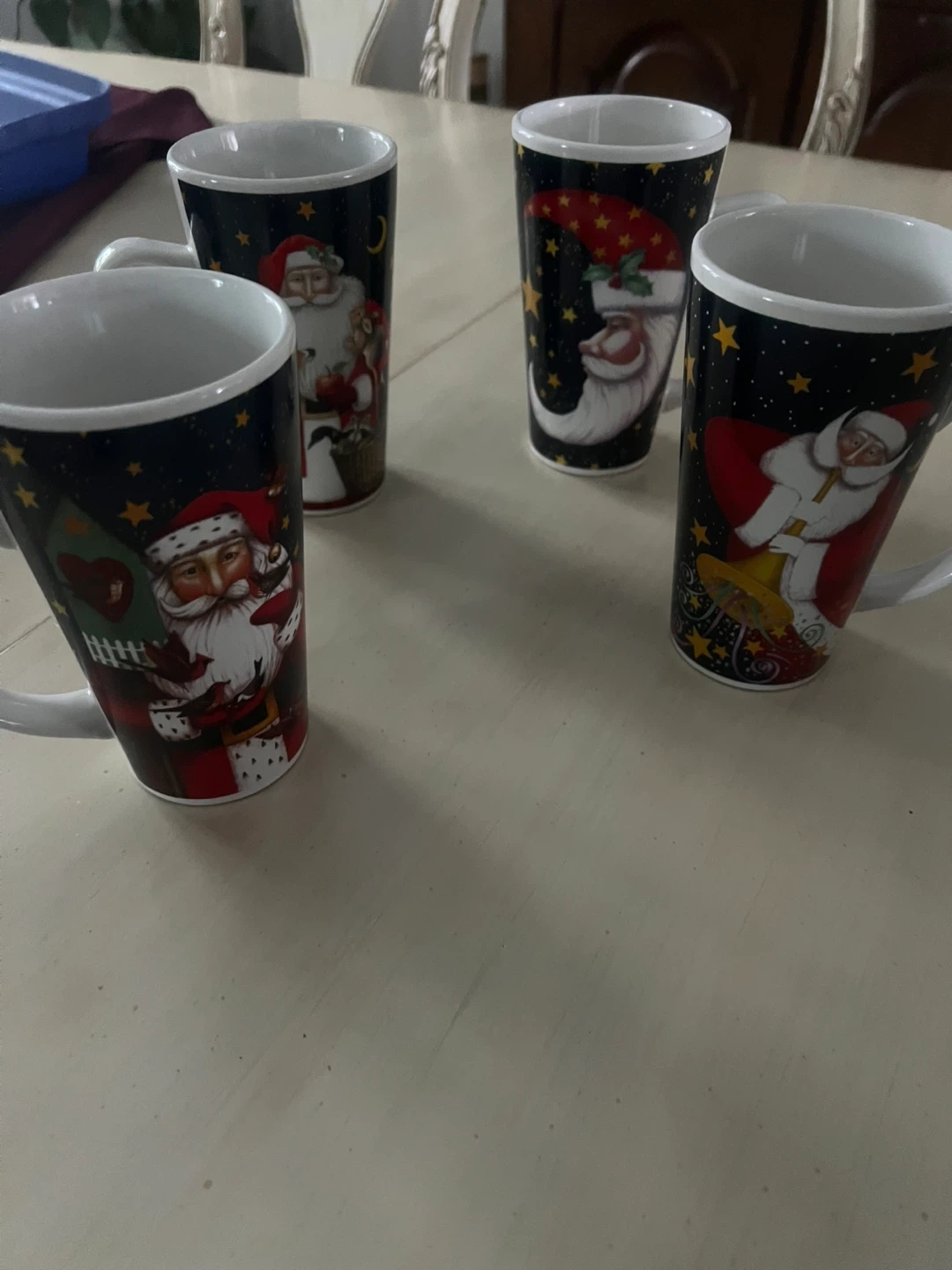Here's a set of four Christmas mugs featuring Santa Claus! They have a festive design with stars and moons on a black background. Perfect for enjoying some hot cocoa this holiday season