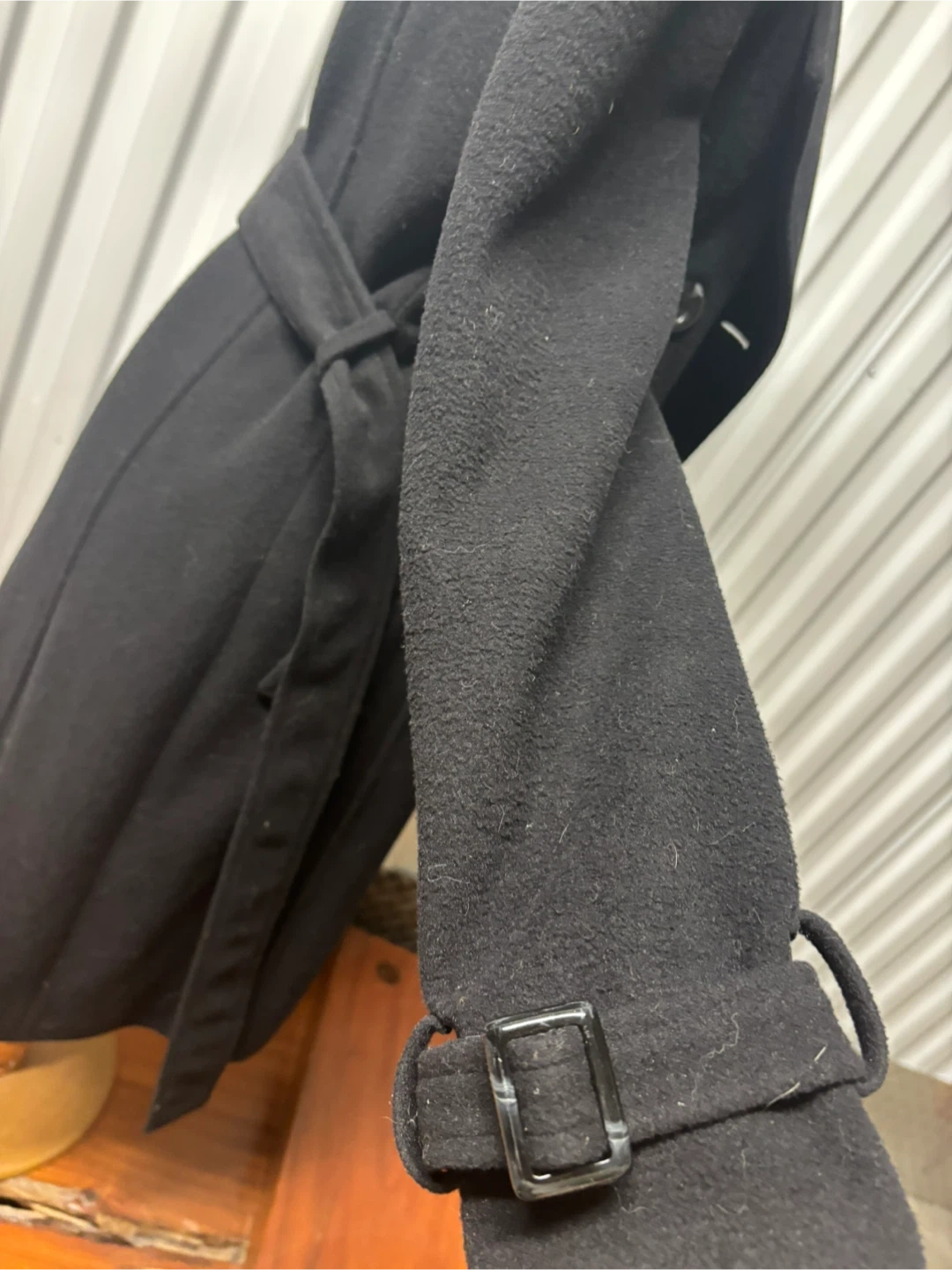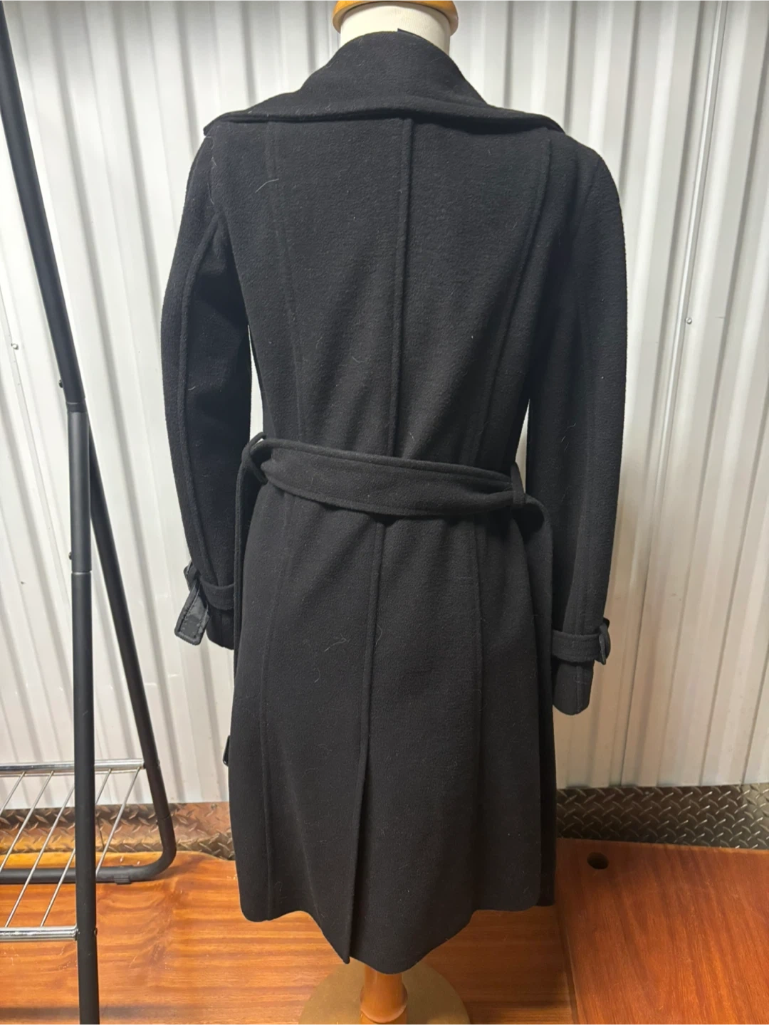 Selling a stylish black wool coat from Juvin & Jeans Co. It's a size 55 and features a classic design with a belted waist. Perfect for staying warm and looking chic!