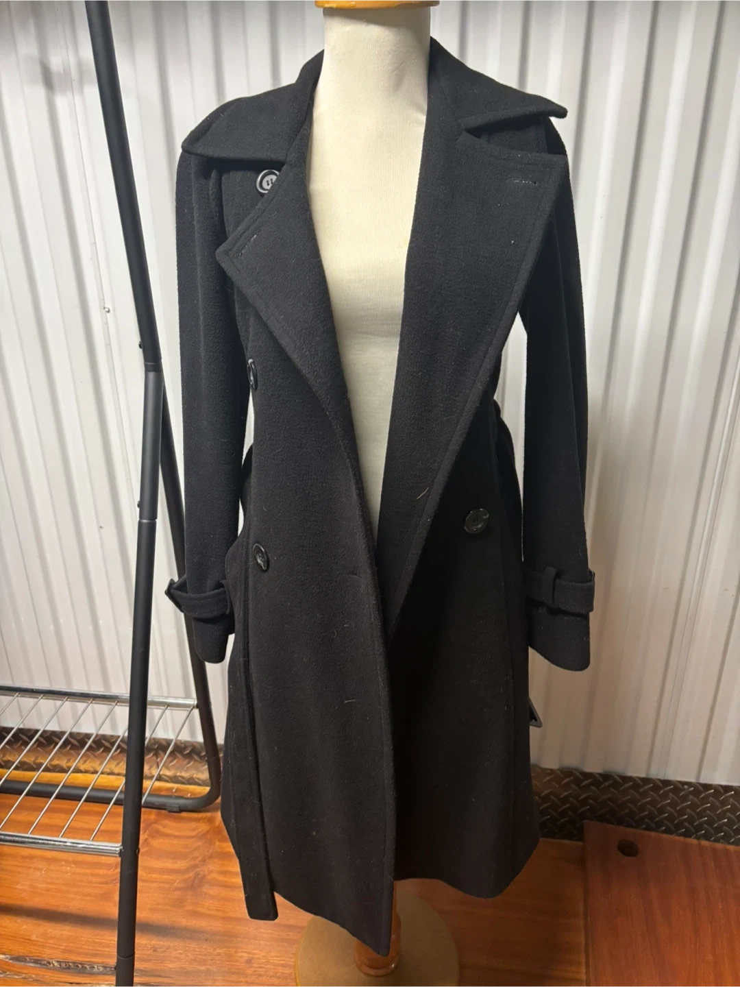 Selling a stylish black wool coat from Juvin & Jeans Co. It's a size 55 and features a classic design with a belted waist. Perfect for staying warm and looking chic!