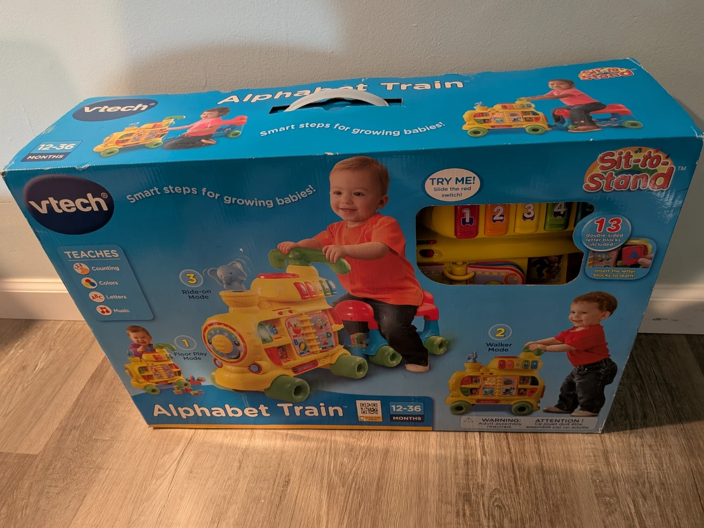 I'm selling a VTech Alphabet Train Sit-to-Stand Walker! It's perfect for little ones aged 12-36 months. This toy helps babies learn counting, colors, letters, and music. It can be used in floor play mode, walker mode, or ride-on mode. It also includes 13 double-sided letter blocks