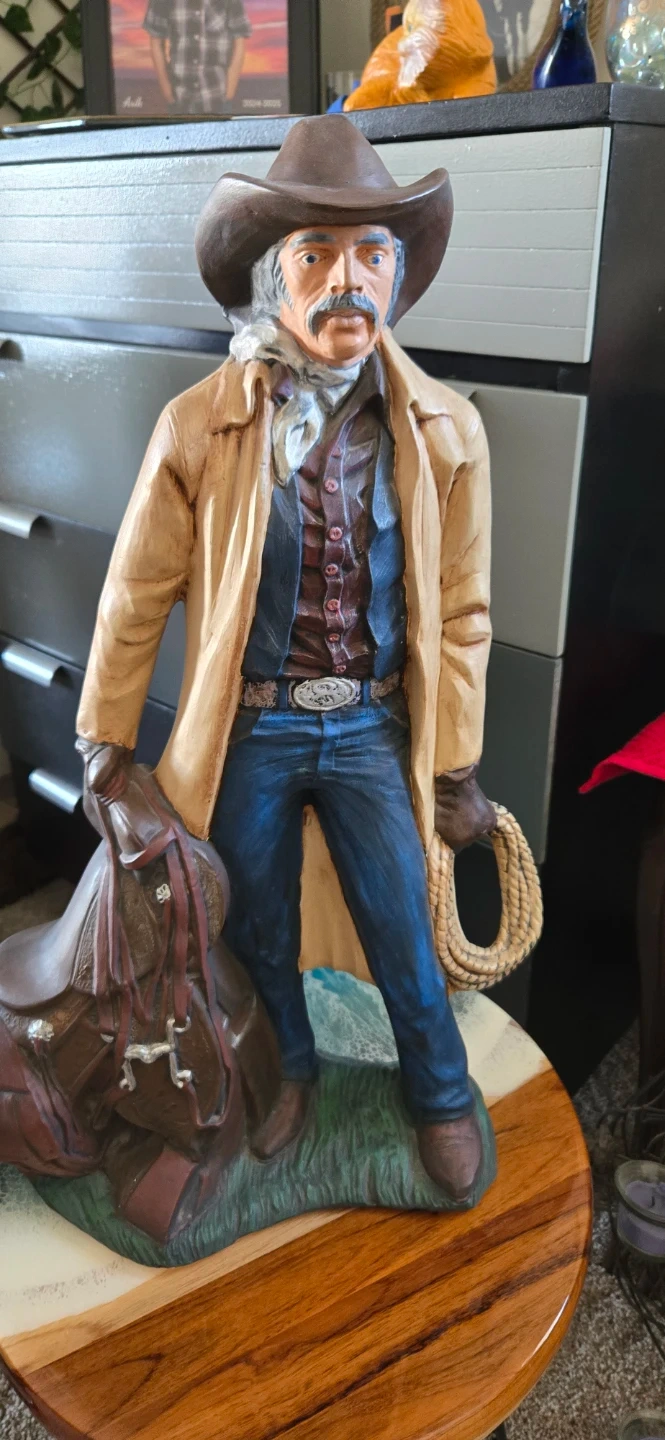 A detailed ceramic figurine of a cowboy holding a saddle and lasso. This piece would look great on a shelf or desk!