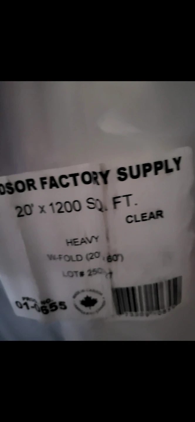 Selling clear plastic sheeting from Windsor Factory Supply. It's heavy duty and comes in a W-fold. Each roll is 20 feet by 1200 square feet