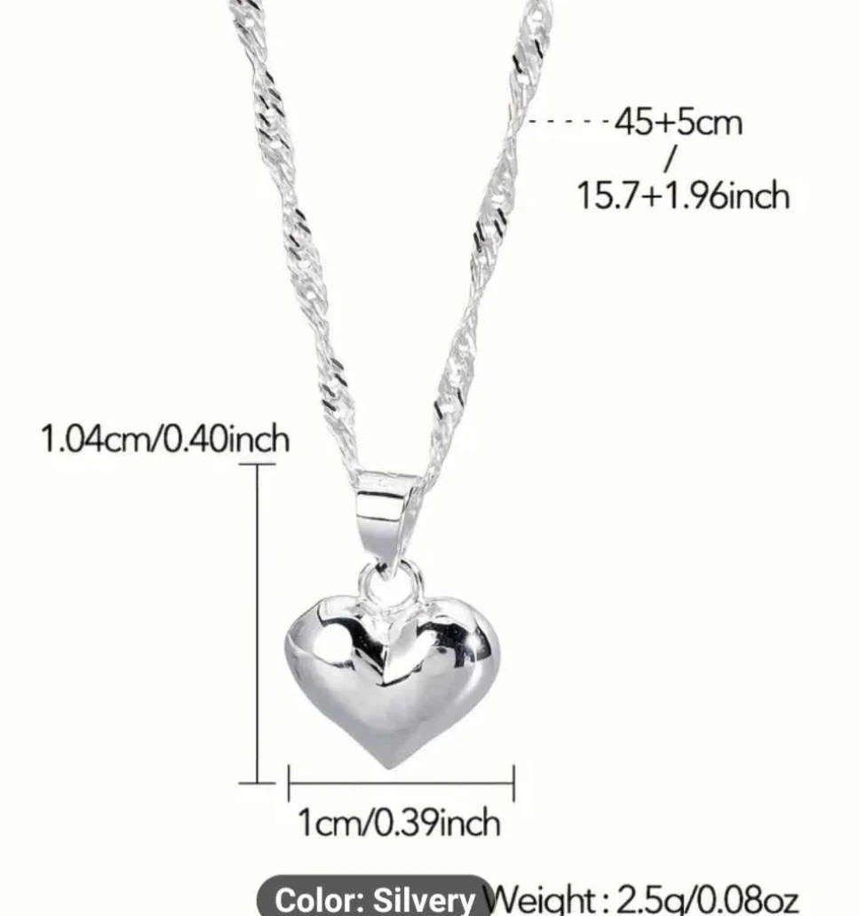 This is a silver heart pendant necklace. The chain length is approximately 45-50cm (15.7 - 1.96 inches). The pendant is about 1cm (0.39 inches) in size. The necklace weighs 2.5g (0.08oz).