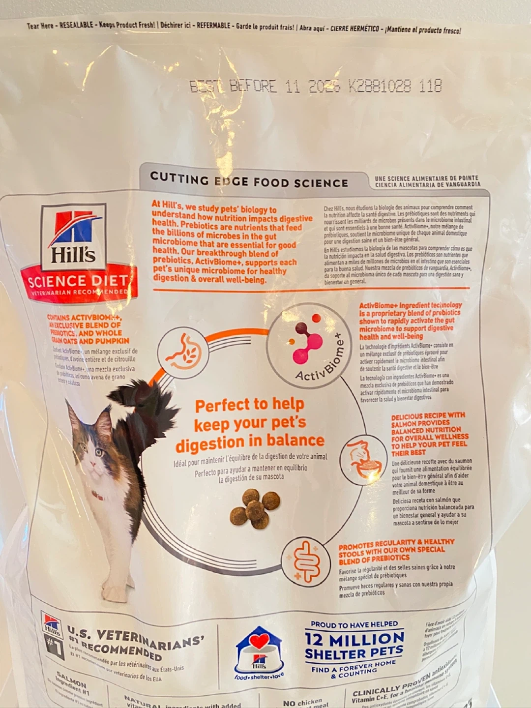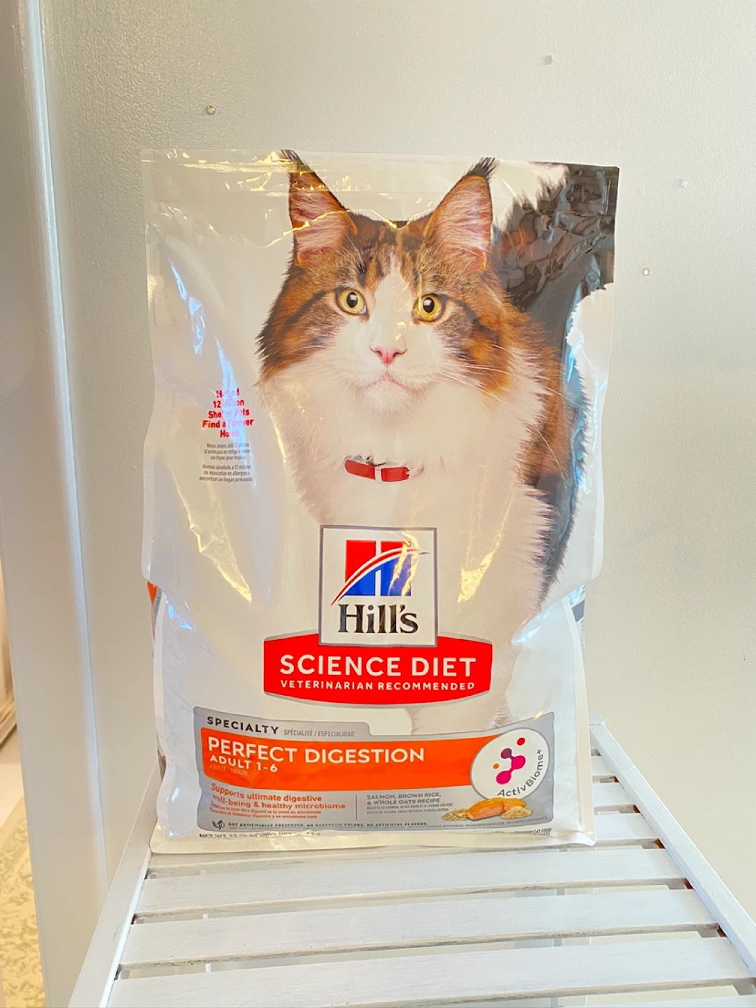 Selling a bag of Hill's Science Diet Perfect Digestion cat food. It's the adult 1-6 formula, specially designed to support your cat's digestive health and microbiome. The recipe includes salmon, brown rice, and whole oats. This is a fresh bag, I just bought it recently and opened and fed my girls 1 lb worth. Is originally a 13 lb bag and has 12 lbs left. My kitties need super high fibre so this just isn’t high enough fibre for them. Best before November 2026