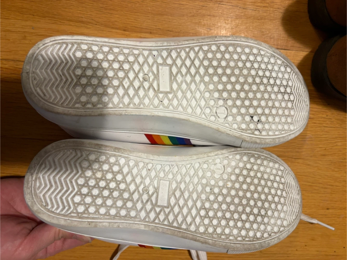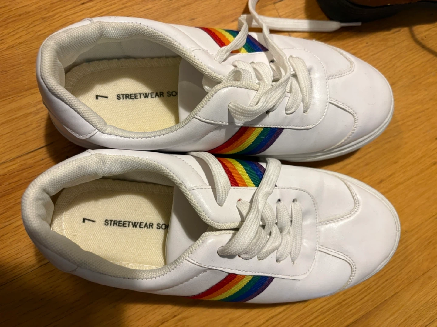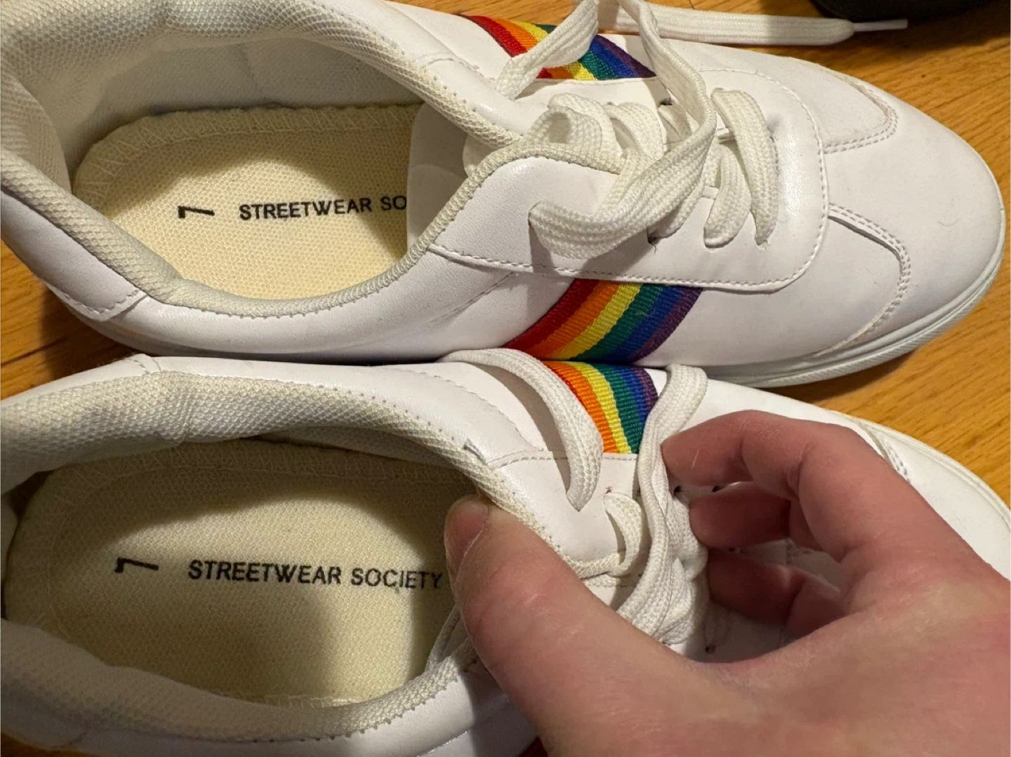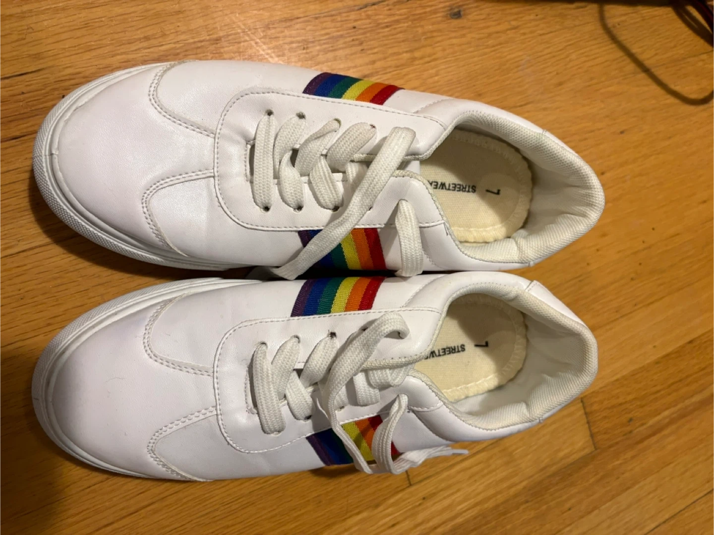 Selling a pair of Streetwear Society sneakers! They're white with a cute rainbow stripe detail. Size 7.pickup at Morley trail NW