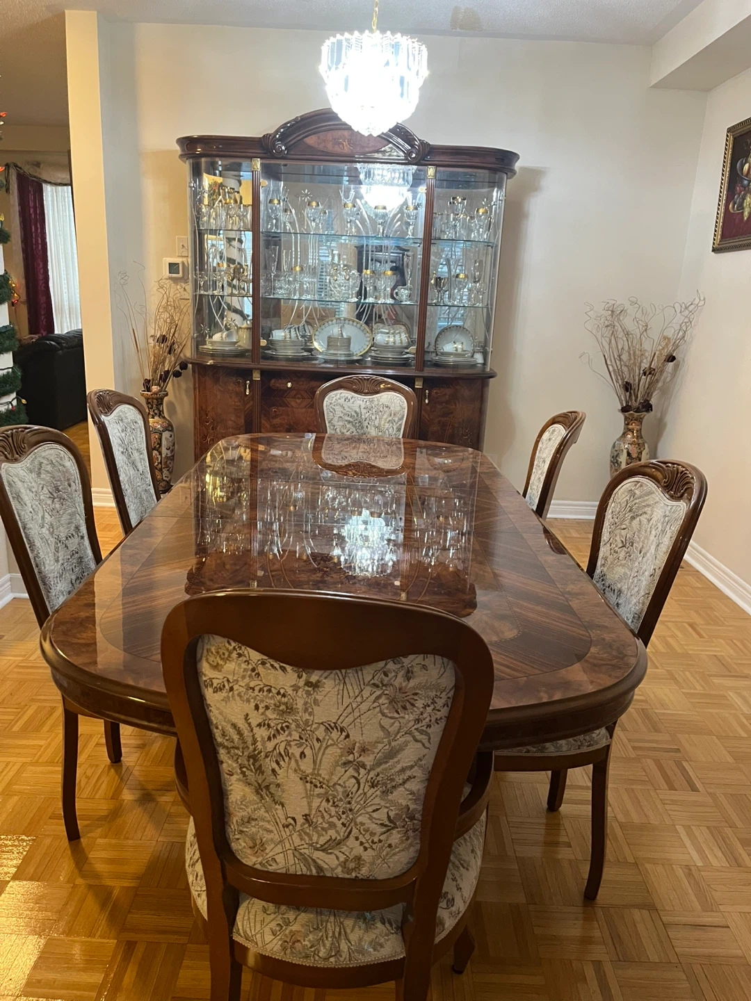 Selling a beautiful dining set that includes a large table, six chairs, and a matching hutch. The table features a glossy wood finish with intricate detailing, and the chairs are upholstered with a floral pattern. This set would be a great addition to any dining room! Whatever is in the cabinet is not for sale.