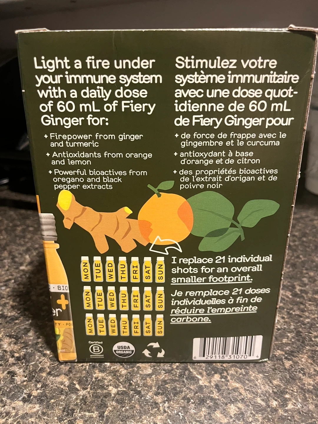 Immune system shot containing a 3-week supply (21 x 60mL shots) of Organic Ginger & Turmeric, for daily boost.