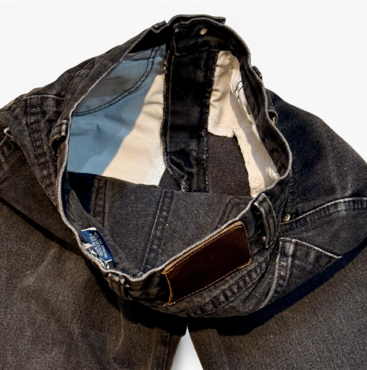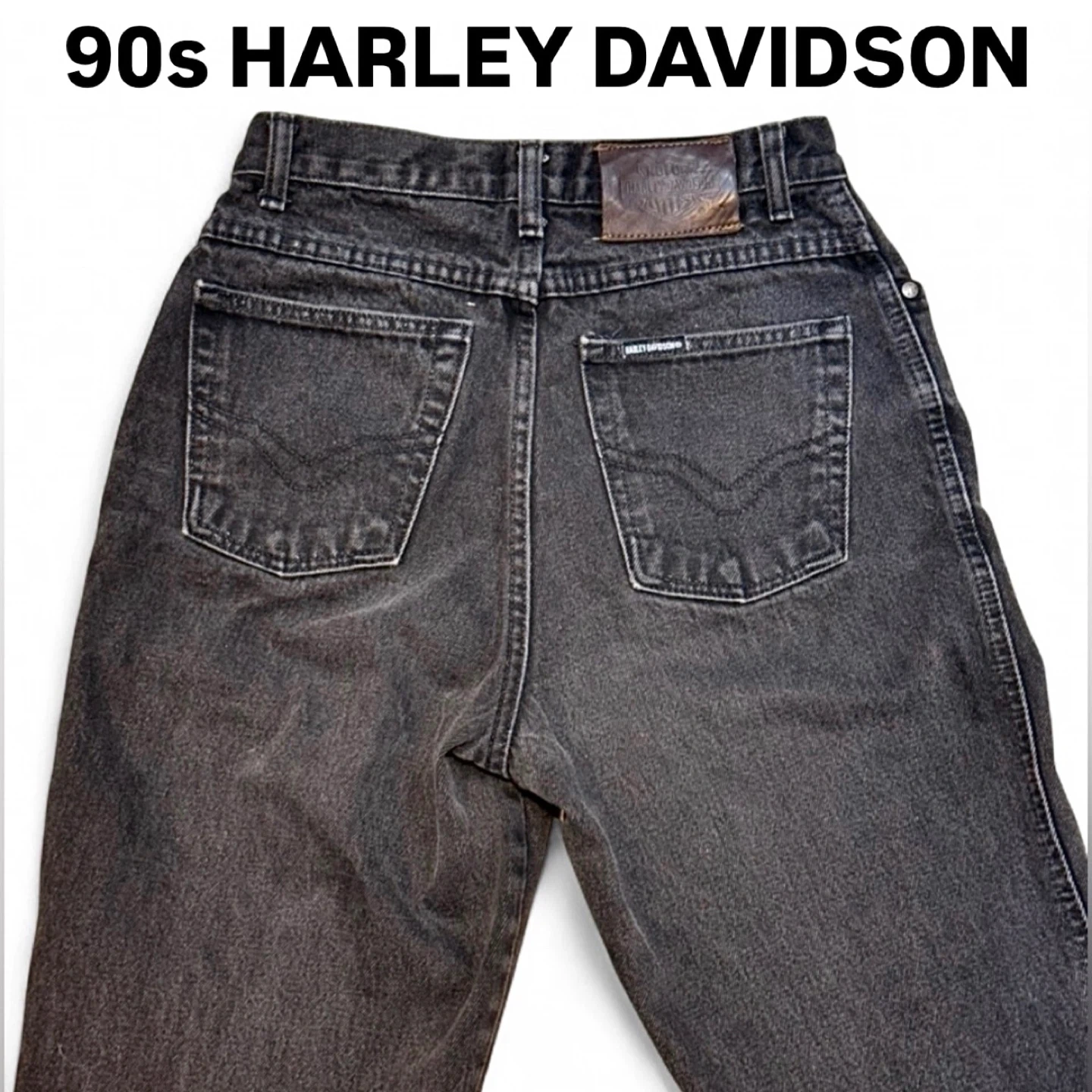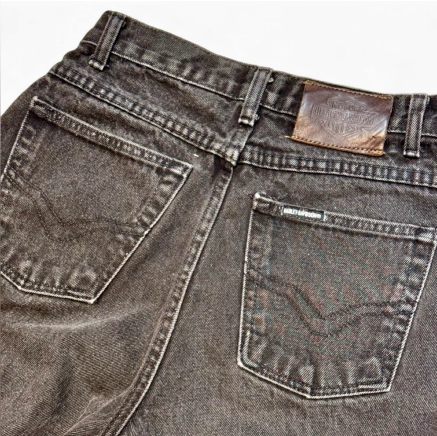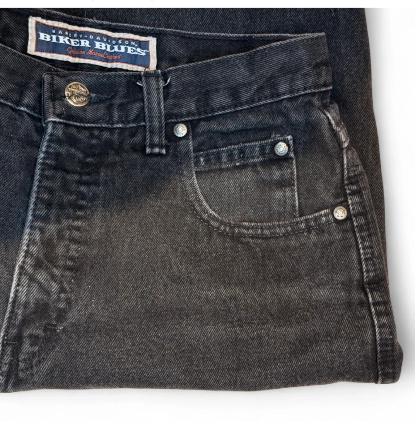 Vintage 90s Harley Davidson “Biker Blues" black denim jeans are sought-after retro HARLEY - DAVIDSON workwear, known for their durable cotton denim, classic straight or relaxed fits, zipper fly, 5-pocket design, and iconic Harley branding, often with a brown leather patch, reflecting authentic 90s biker style and American manufacturing.