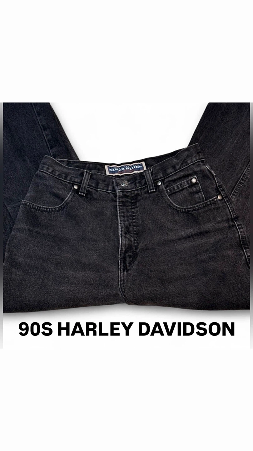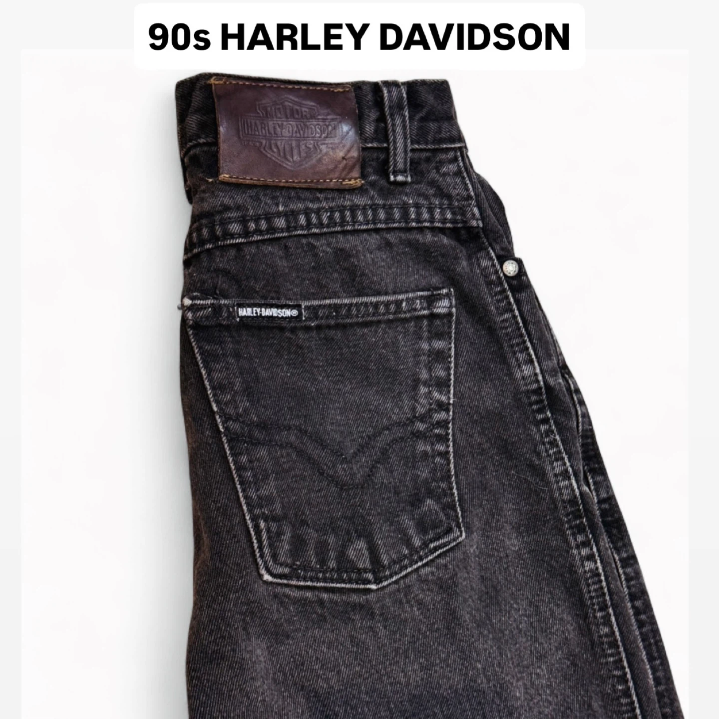 Vintage 90s Harley Davidson “Biker Blues" black denim jeans are sought-after retro HARLEY - DAVIDSON workwear, known for their durable cotton denim, classic straight or relaxed fits, zipper fly, 5-pocket design, and iconic Harley branding, often with a brown leather patch, reflecting authentic 90s biker style and American manufacturing.