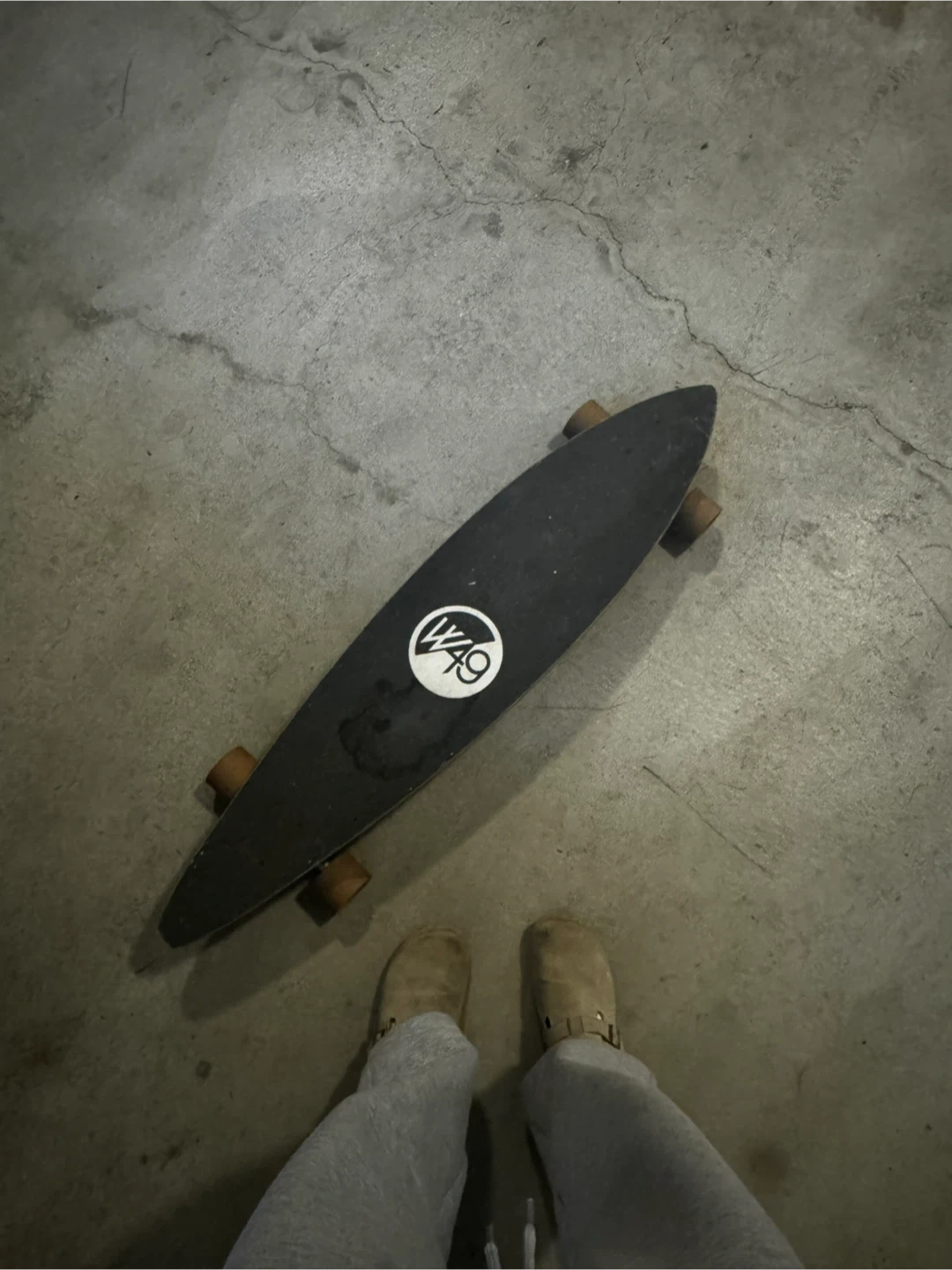 Selling a used W49 longboard skateboard. It's got a cool design on the bottom and is ready for some cruising around town. Super smooth ride- no problems- just a bit worn. Perfect for beginners or experienced riders looking for a fun board!