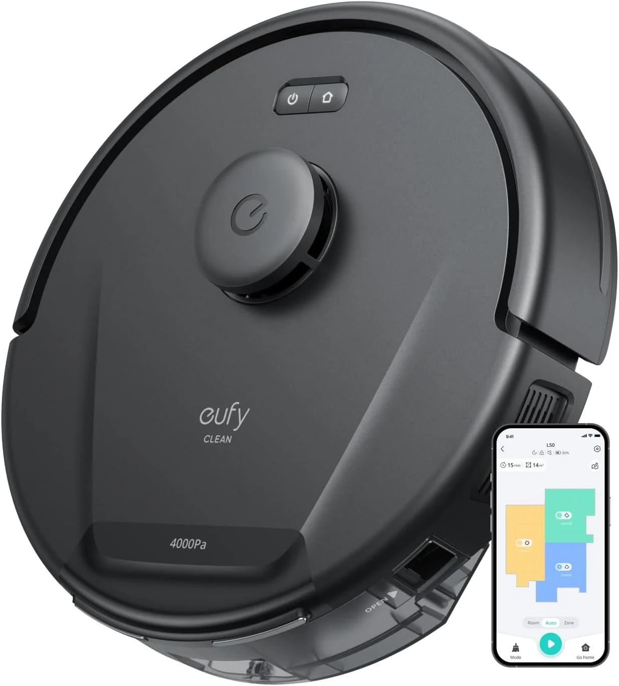 New Eufy Clean L50 robotic vacuum cleaner with intelligent laser navigation! It features powerful suction and customizable AI mapping. It can clim up to 20mm and is ideal doe hardwood floors, tile and carpet. The box includes the robotic vacuum, charging dock, and quick start guide.