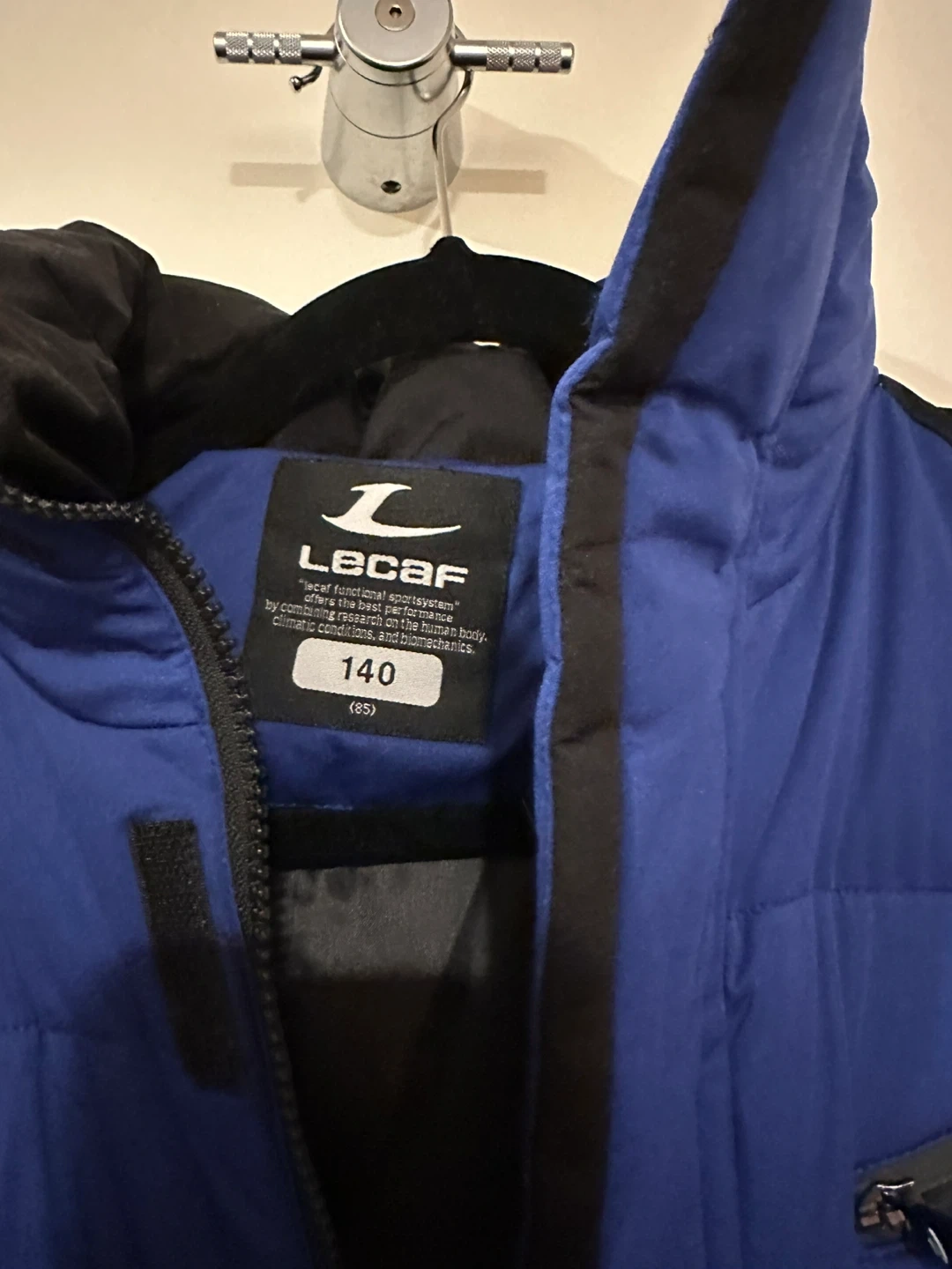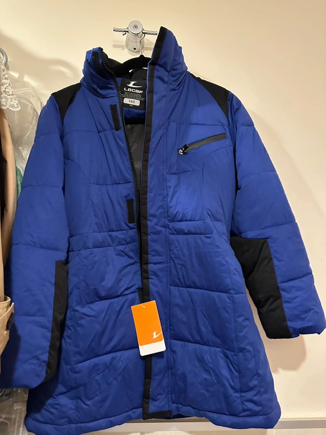 Selling a LeCAF puffer jacket in blue with black accents. The size is 140, which is approximately a US size 8. It's in great condition and perfect for staying warm! It’s NEW! This is from Korea.