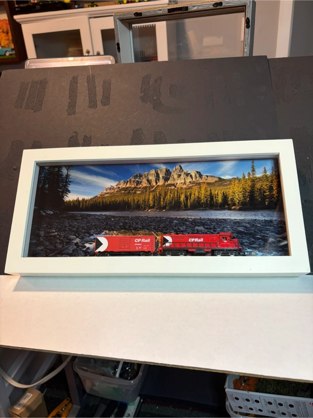 Framed landscape art featuring a CP Rail train! The frame is white and the picture shows a beautiful mountain scene with a river and trees in the foreground, with a miniature CP Rail train.