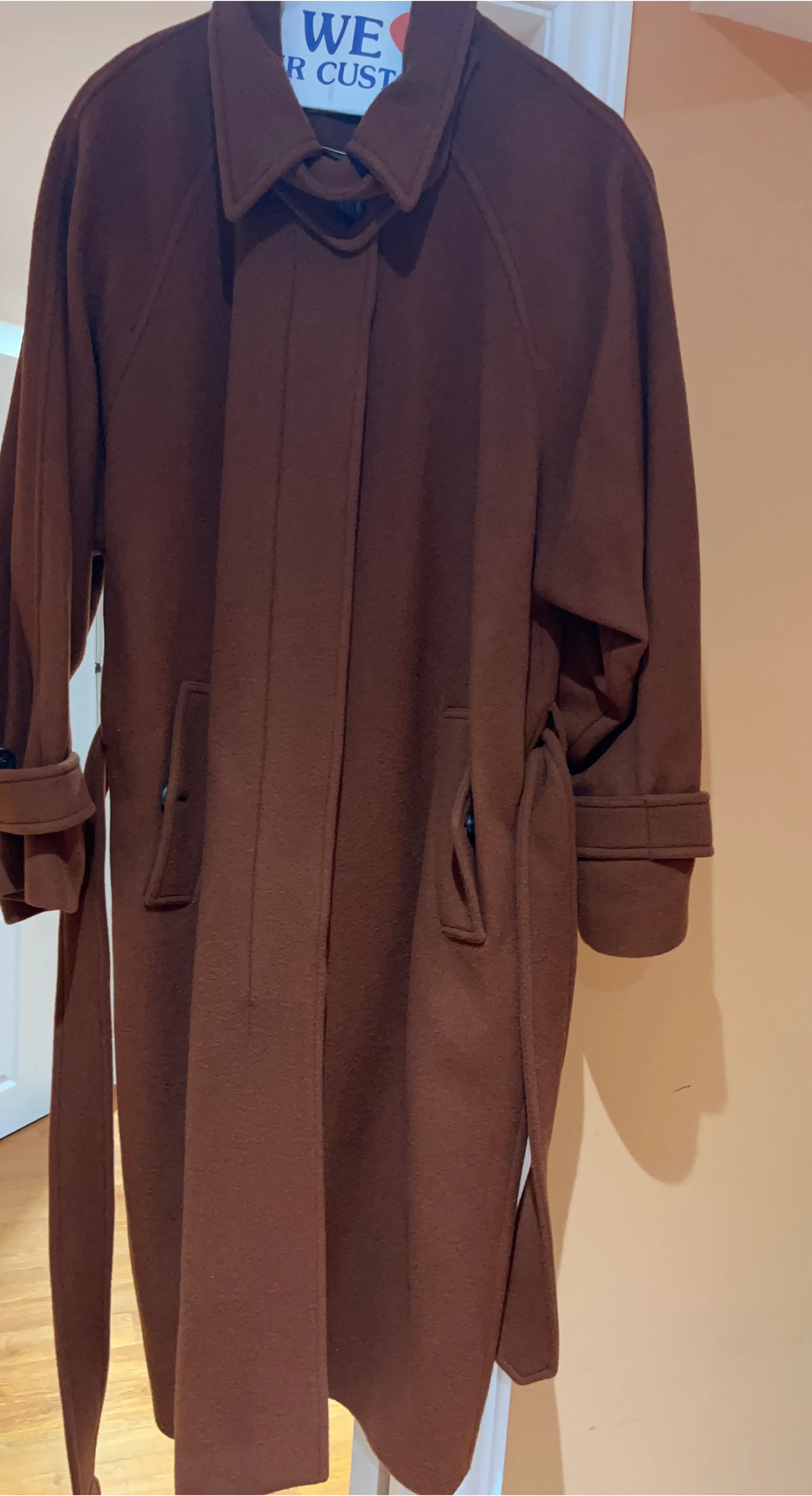 Here's a stylish brown trench coat, perfect for cooler weather! It features a classic design with a belted waist and is made from a wool blend. This coat is in great condition and ready for a new owner!