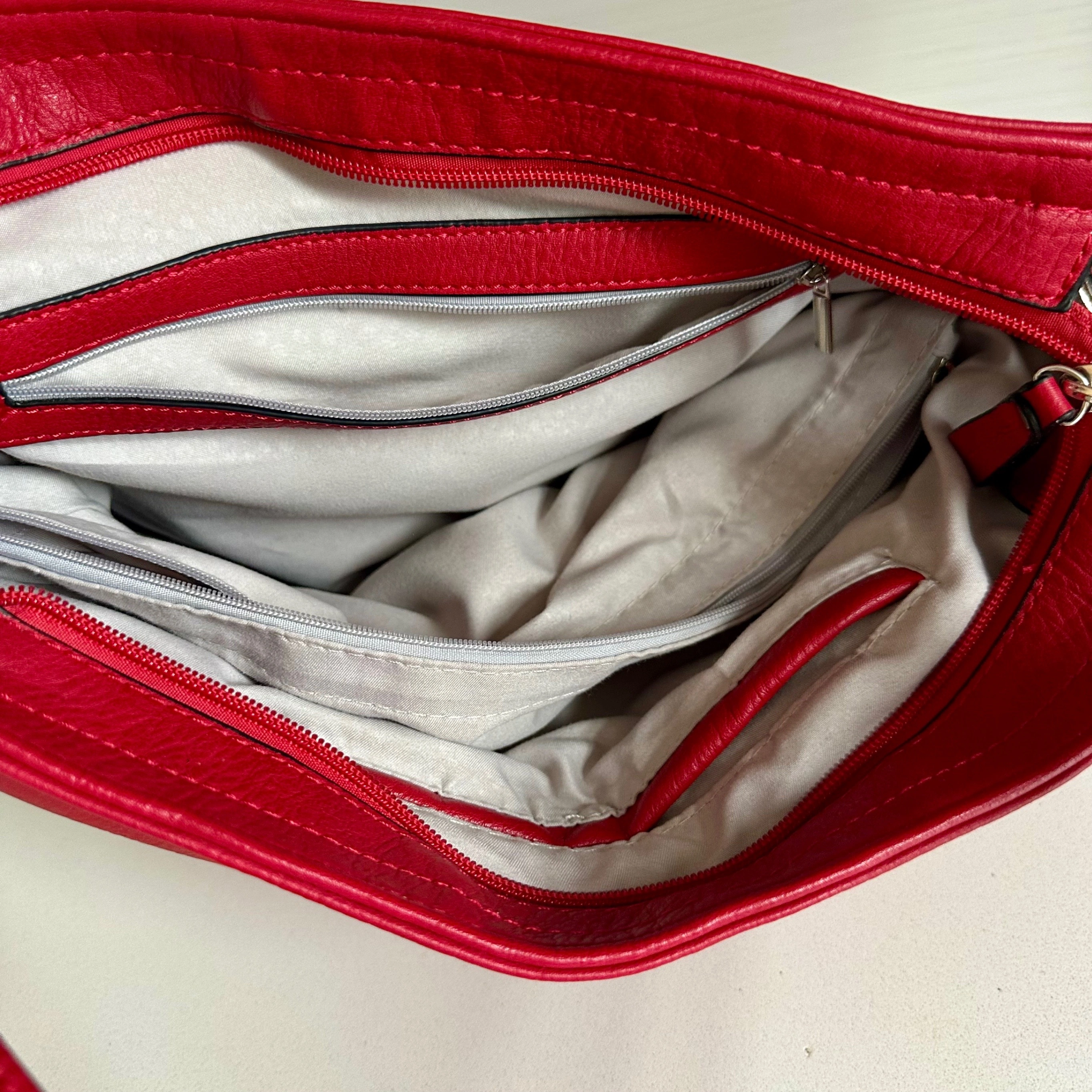 In great condition (used a couple times) MKF Collection by Mia K Farrow Emily Soft Vegan Leather Hobo Handbag. A stylish and functional accessory crafted for both fashion and convenience! Colour is "Emily Red". There is some wear (peel) around the silver handle and two spots at the bottom of the purse (all featured in photos). Crafted from high-quality vegan leather, this bag offers a cruelty-free and sustainable alternative. The interior is lined with a soft fabric.The interior features a spacious compartment, providing ample room for your essentials. Stay organized with two convenient slip-in pockets within the main compartment. A mid-centered zipper compartment offers an additional storage option for your belongings. Keep your valuables secure in the wall zipper pocket inside. On the exterior, a back-zipper pocket adds practicality for quick and easy access to essentials. The removable handle, with an 8-inch drop, provides versatility in carrying options, allowing you to customize your look and comfort. - Fabric type: Vegan leather - Care instructions: Machine wash cold, inside out. Tumble dry low. Do not iron. Do not dry clean. - Closure type: Zipper - Lining: Fabric - Hardware: Silver