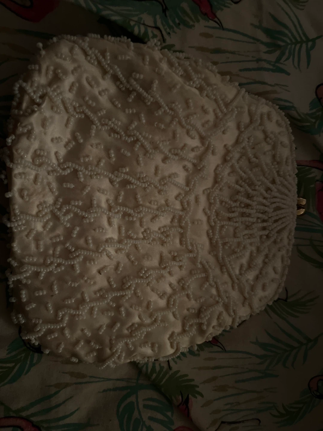 Selling a vintage beaded clutch purse in ivory colour. It's in good condition and perfect for a special occasion or to add a touch of elegance to any outfit!