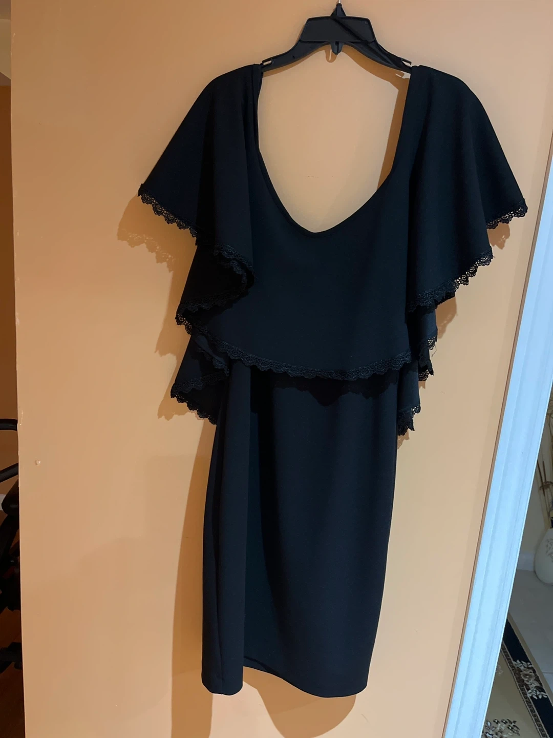 A lovely black dress featuring delicate lace trim. It's in great condition and ready for a new closet! The dress has a flattering silhouette and is perfect for various occasions. It's a stylish and versatile piece to add to your wardrobe
