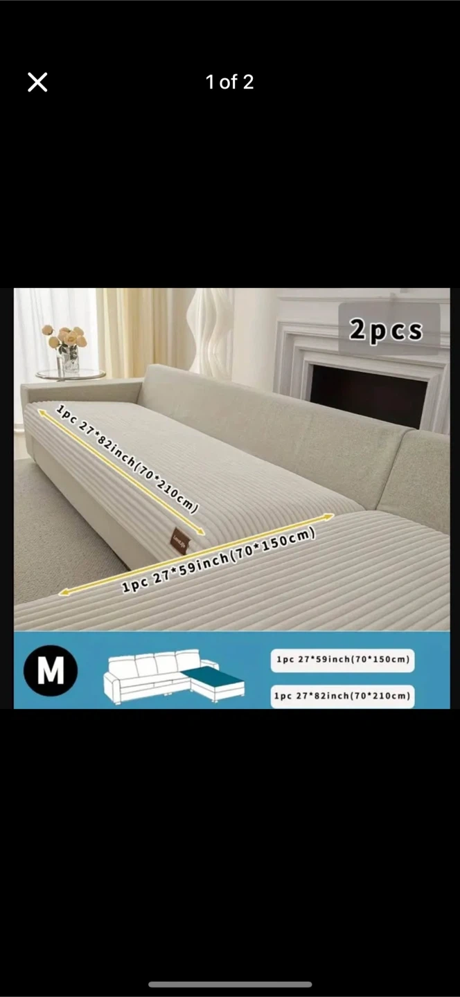 Selling a brand new sofa cover set! It includes two pieces: one 27*82 inch (70*210cm) and one 27*59 inch (70*150cm). This set is size M and comes in its original packaging