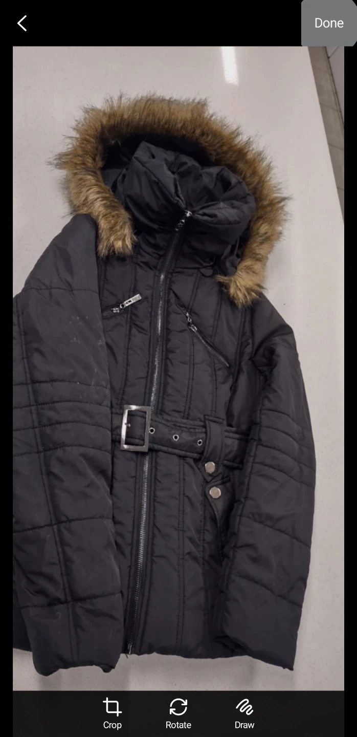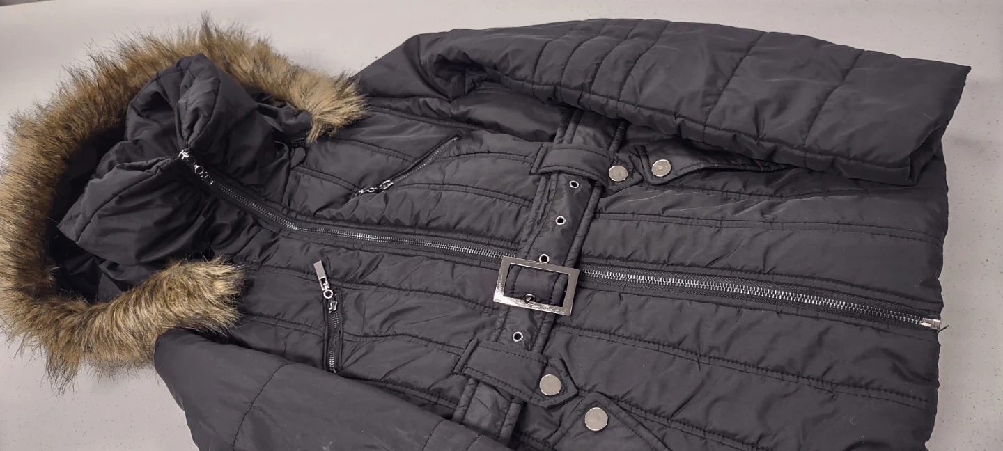 Selling a black winter jacket featuring a stylish fur hood! It has a belted design and is perfect for keeping warm during the colder months. The jacket appears to be in good condition and ready for a new owner.