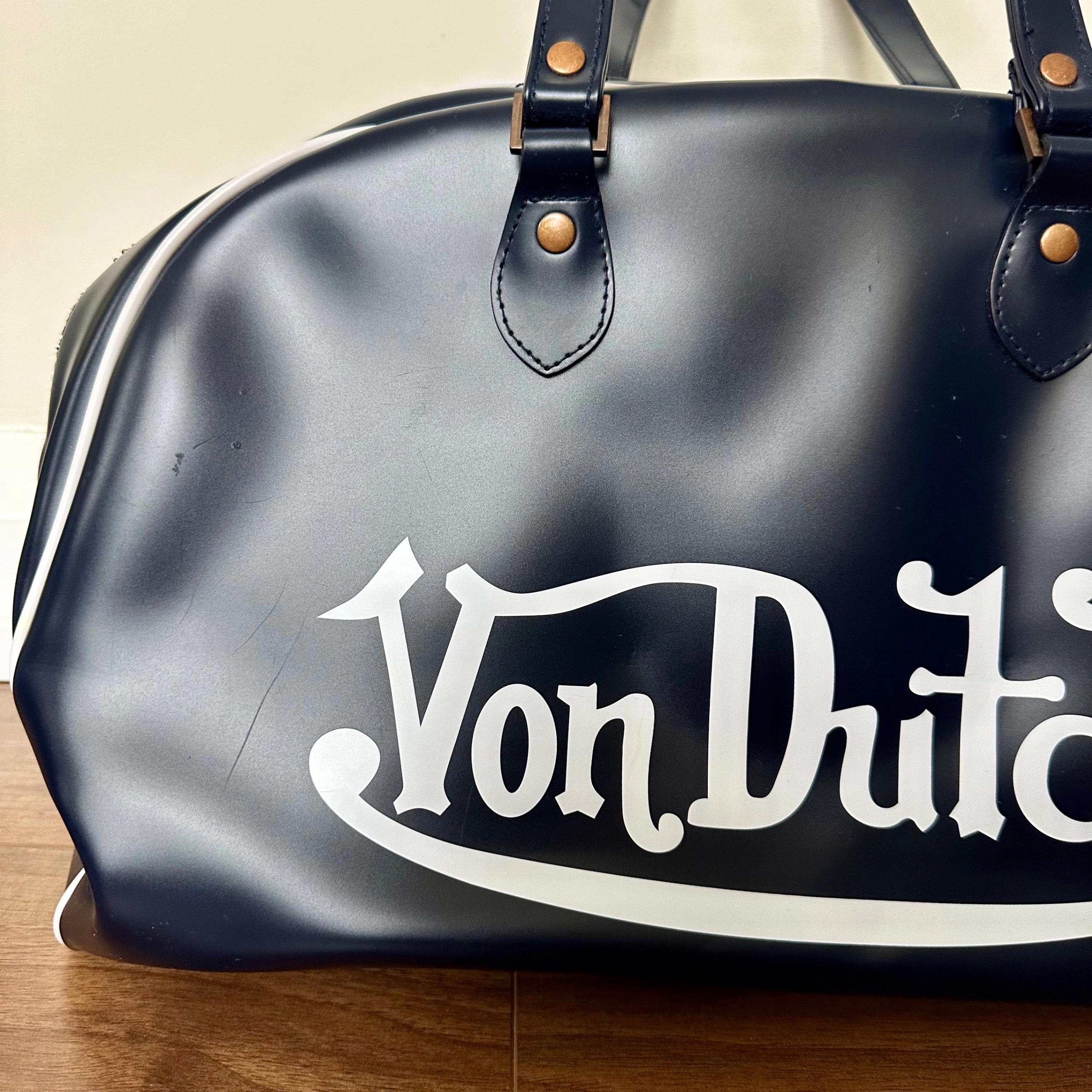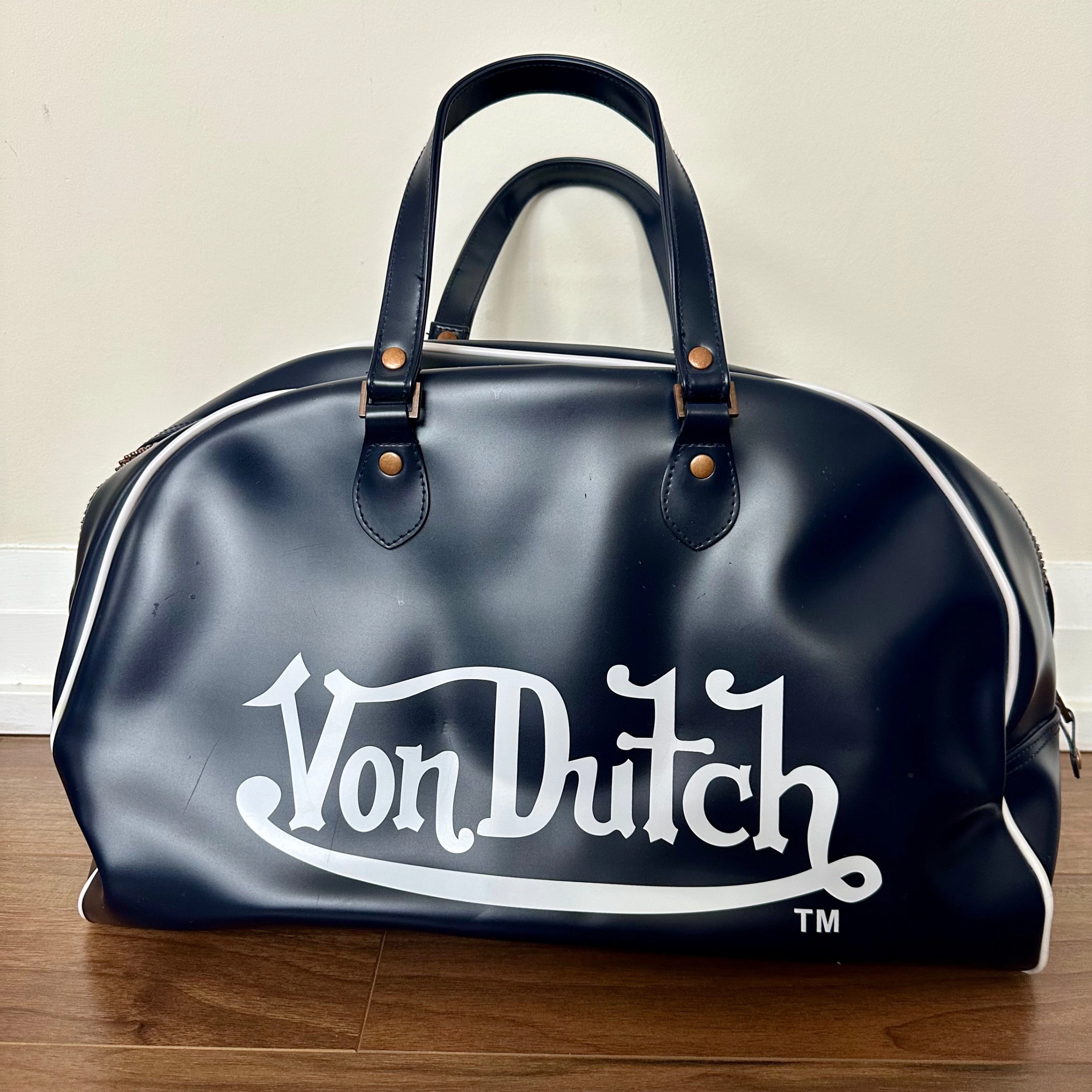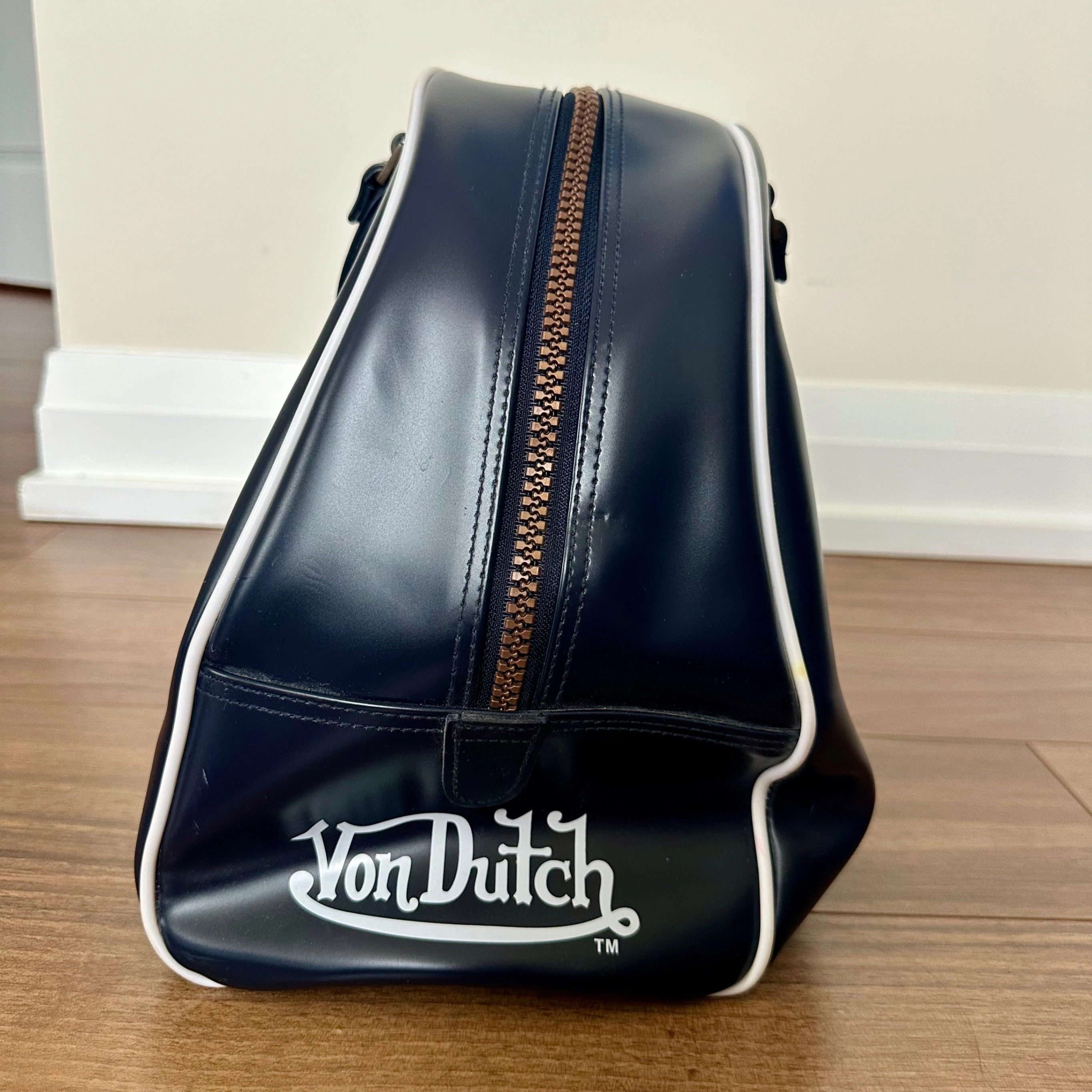 Used, but in amazing condition, vintage Von Dutch vinyl duffle bowling bag. Colour is navy blue with white lettering / detailing. There is one zipper compartment on the inside. Brass metal zipper and detailing. Brass metal feet to protect bag. Makes for a great and stylish travel / weekender bag!