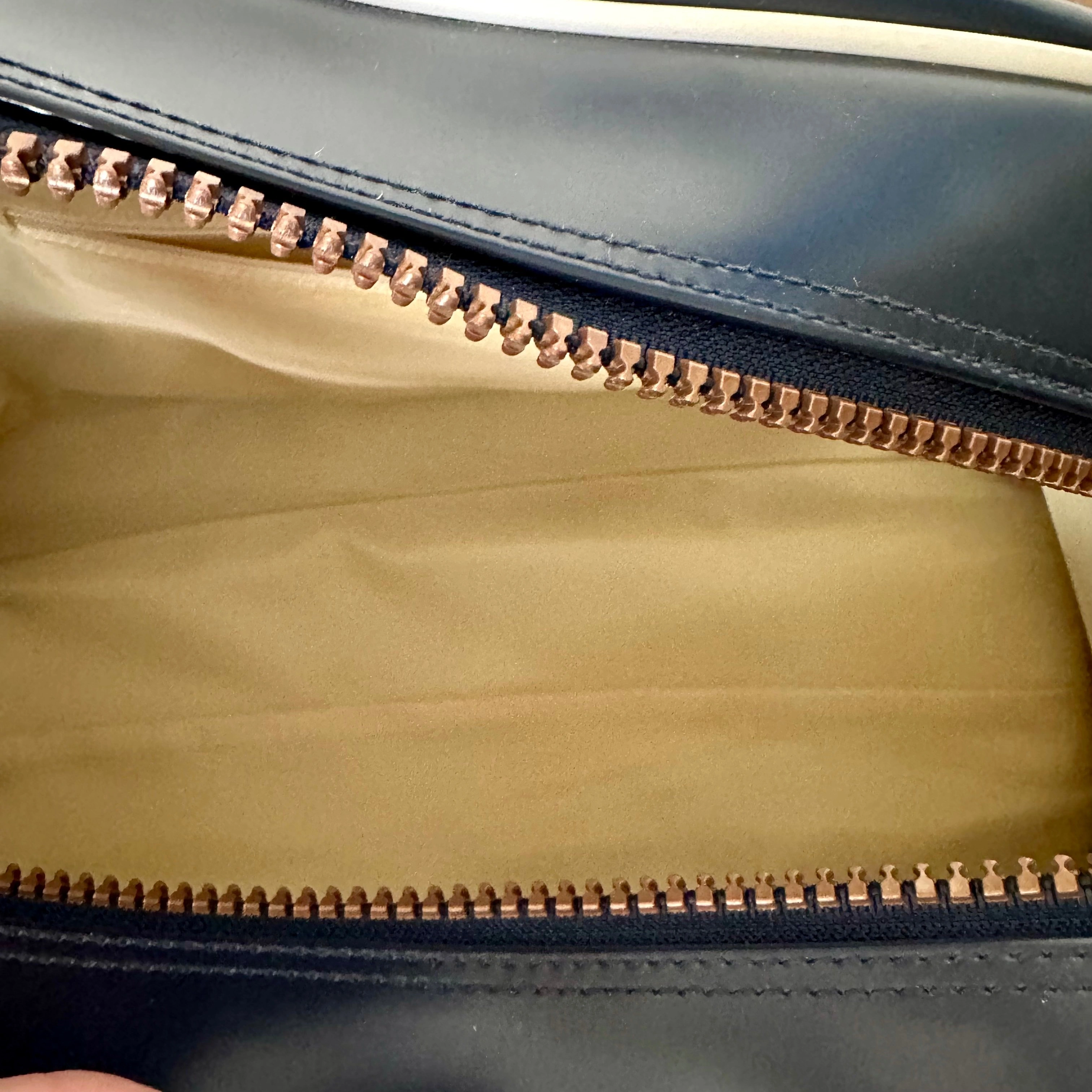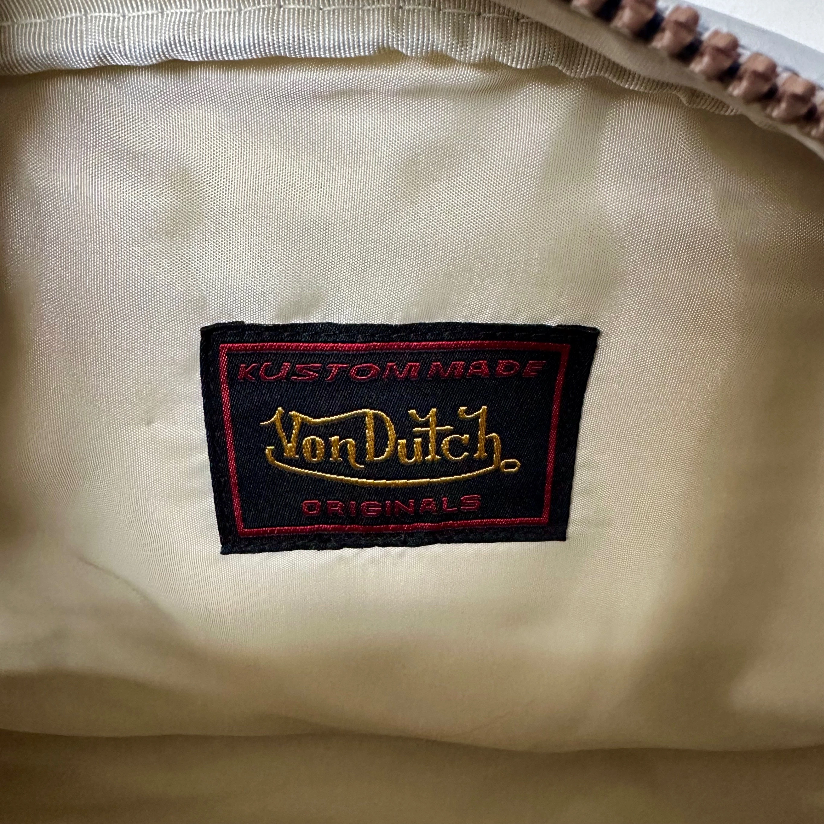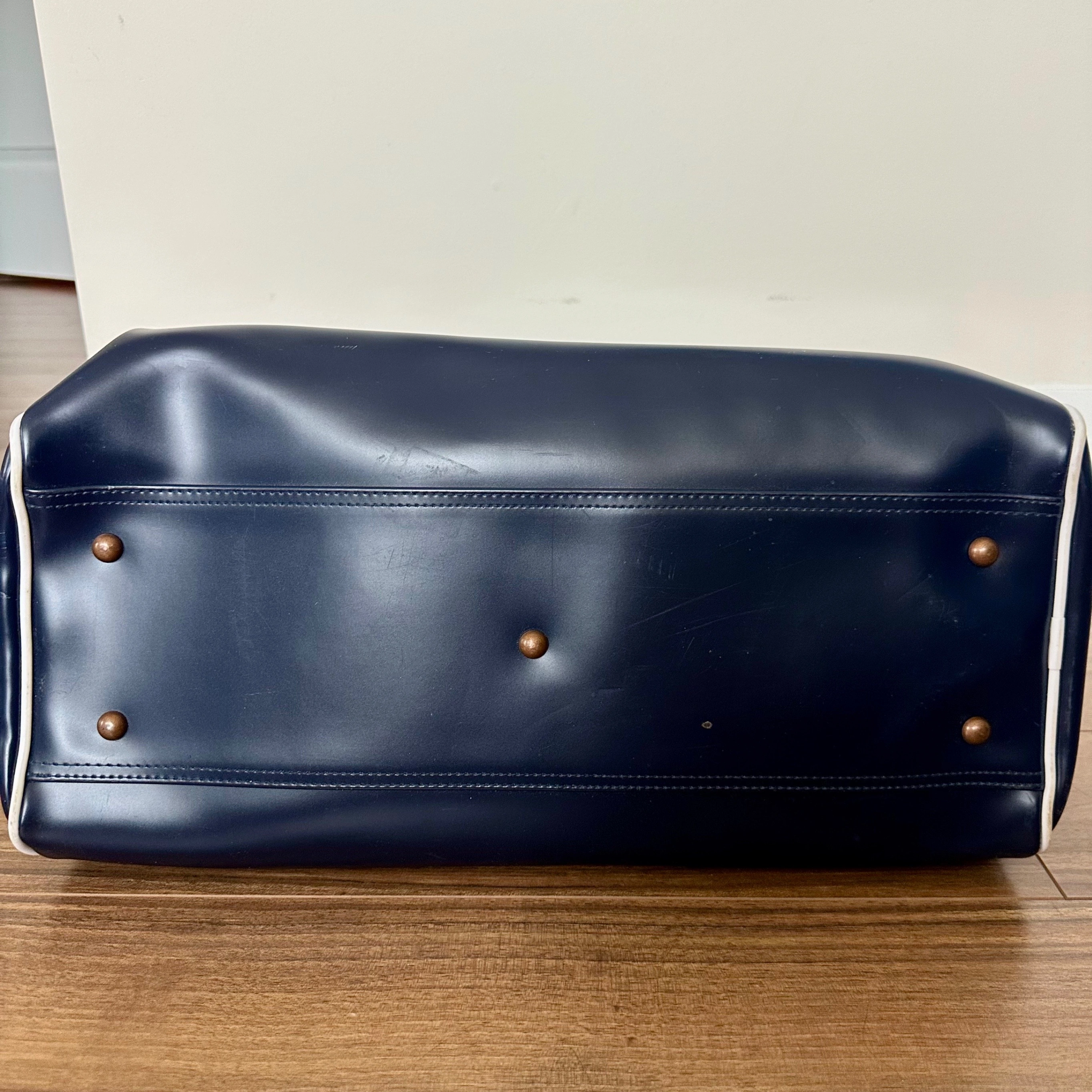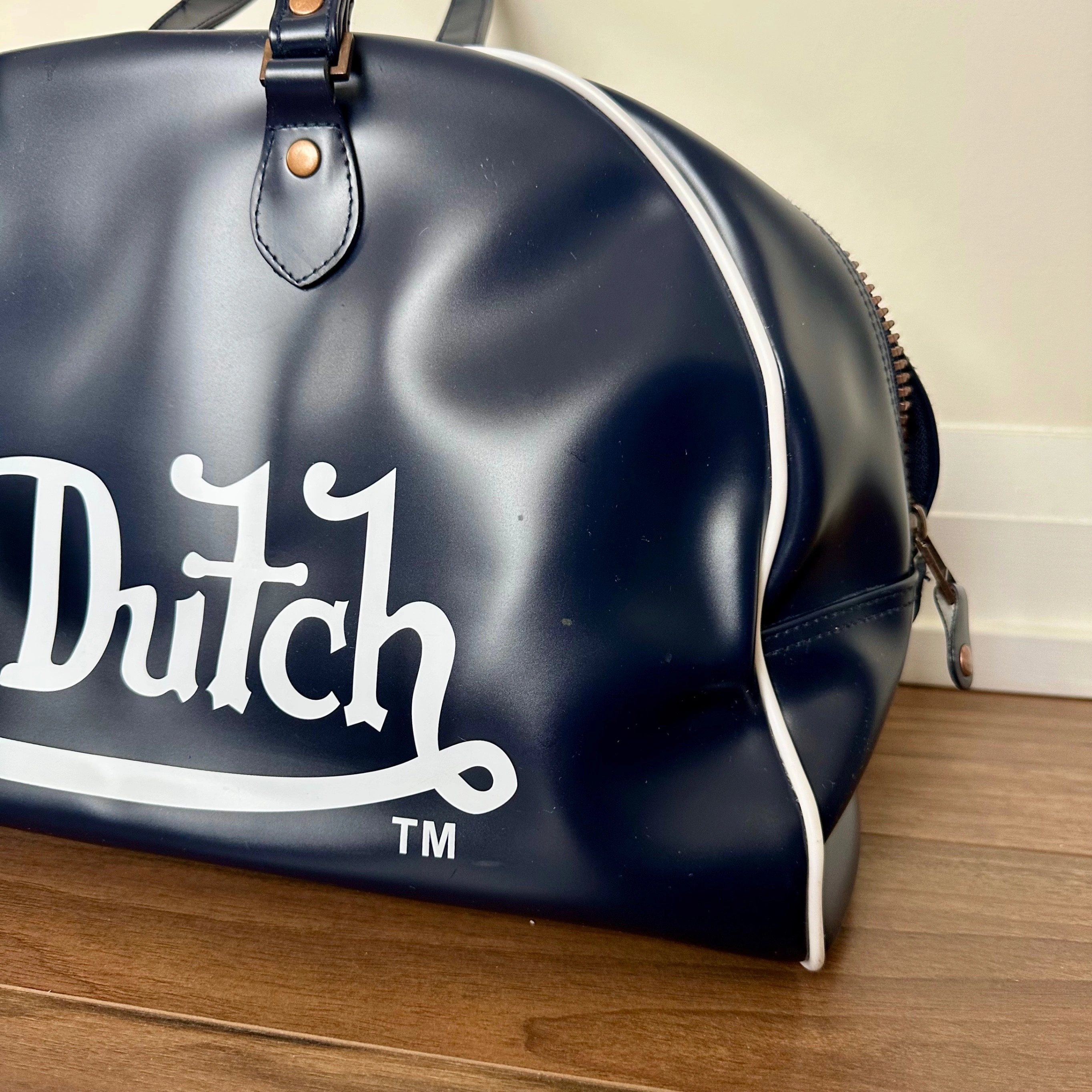 Used, but in amazing condition, vintage Von Dutch vinyl duffle bowling bag. Colour is navy blue with white lettering / detailing. There is one zipper compartment on the inside. Brass metal zipper and detailing. Brass metal feet to protect bag. Makes for a great and stylish travel / weekender bag!