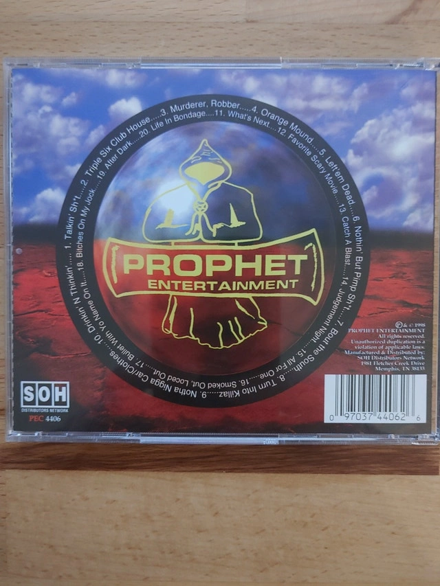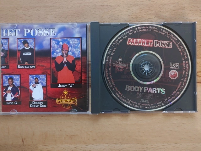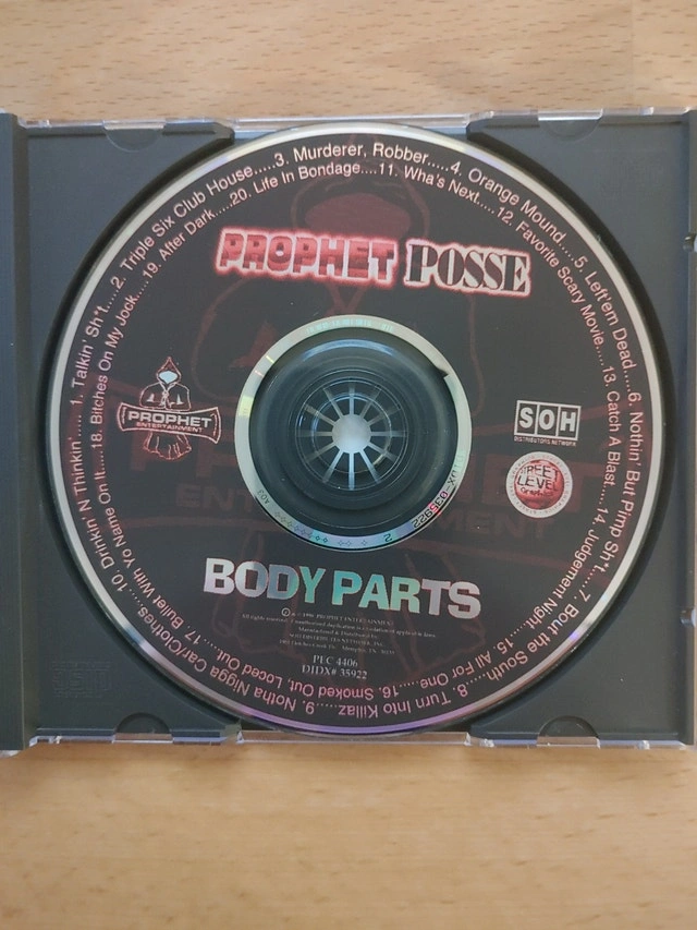 Rare original 1998 Prophet Posse Body Parts CD featuring D.J. Paul, Da Rocafelaz, Droopy, Gangsta Boo, Indo "G", Juicy "J", M-Child, Nigga Creep, The Dayton Family, The Kaze, Three 6 Mafia. Mint condition CD and inner. Many copies of this CD will skip on track 20, but this one plays fine. For sale by owner. Curbside pickup available. Cash and cashless payments accepted.