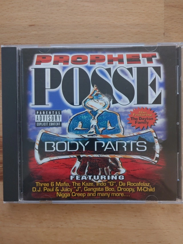 Rare original 1998 Prophet Posse Body Parts CD featuring D.J. Paul, Da Rocafelaz, Droopy, Gangsta Boo, Indo "G", Juicy "J", M-Child, Nigga Creep, The Dayton Family, The Kaze, Three 6 Mafia. Mint condition CD and inner. Many copies of this CD will skip on track 20, but this one plays fine. For sale by owner. Curbside pickup available. Cash and cashless payments accepted.
