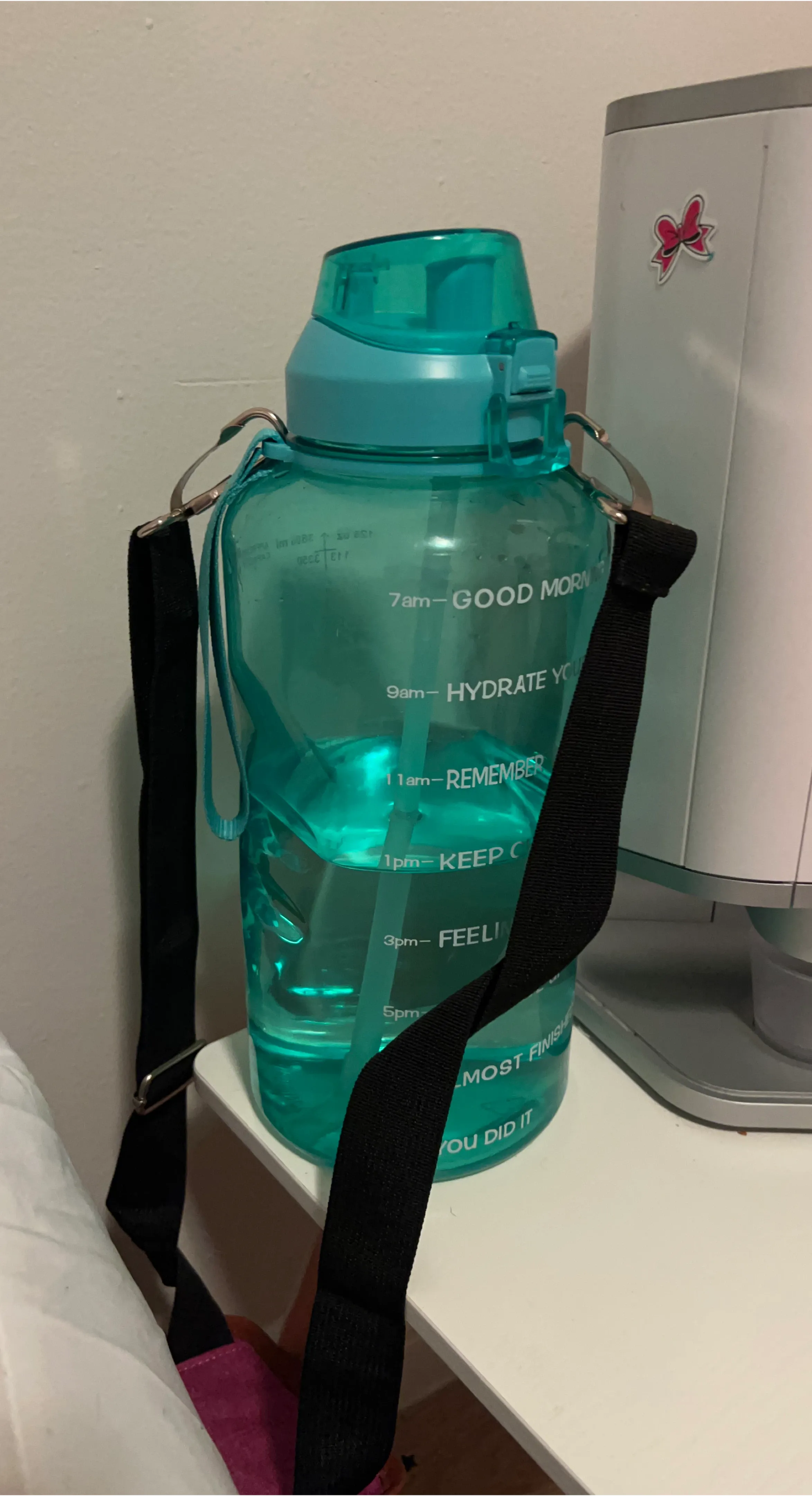Stay hydrated with this time-marked water bottle! It has a convenient strap for easy carrying. The bottle is marked with times to remind you to drink throughout the day, from 7am to 5pm. It's a great way to keep track of your water intake and stay on top of your hydration goals