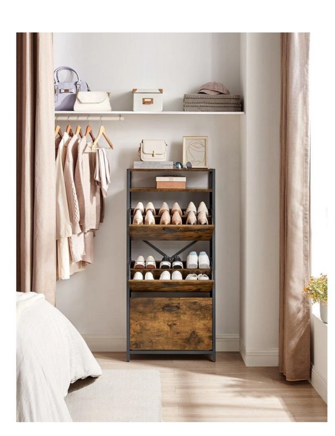 Tall Rustic Brown Shoe Storage Cabinet 3 flip doors