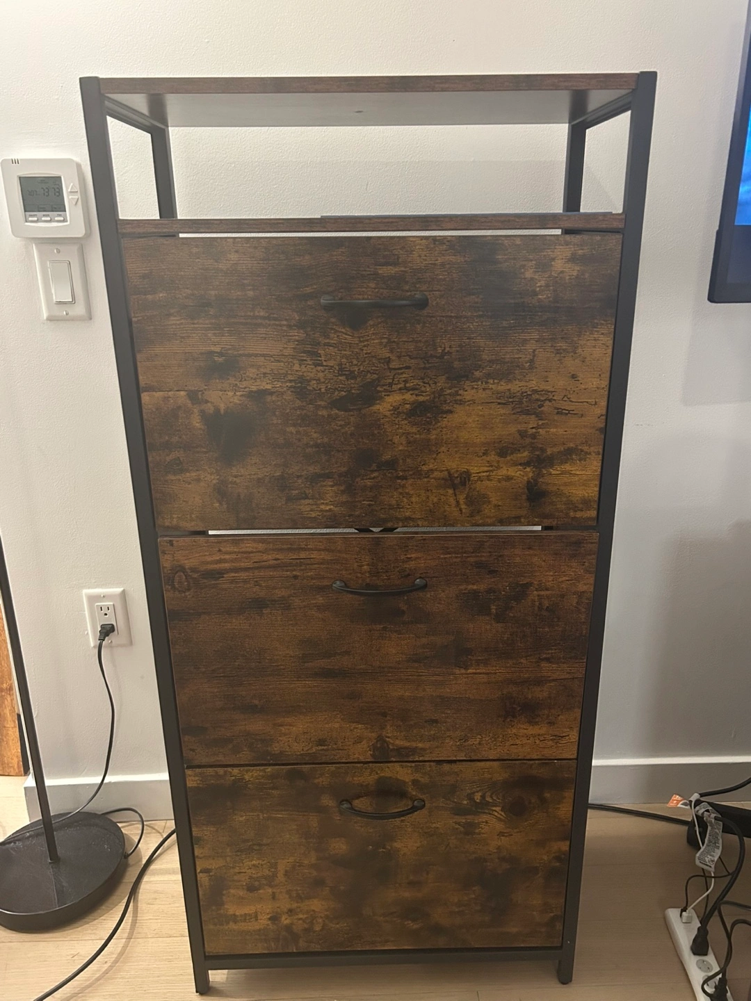Like-new rustic brown industrial design shoe storage cabinet already assembled and perfect for keeping your entryway or closet organized!