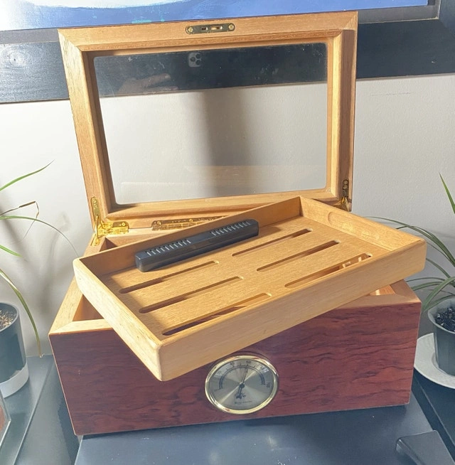 Solid mahogany-finish desktop humidor with clear glass display lid, full Spanish cedar lining and removable cedar tray with multiple slots for organization. Keeps perfect 65-72% RH out of the box – just drop in your sticks.