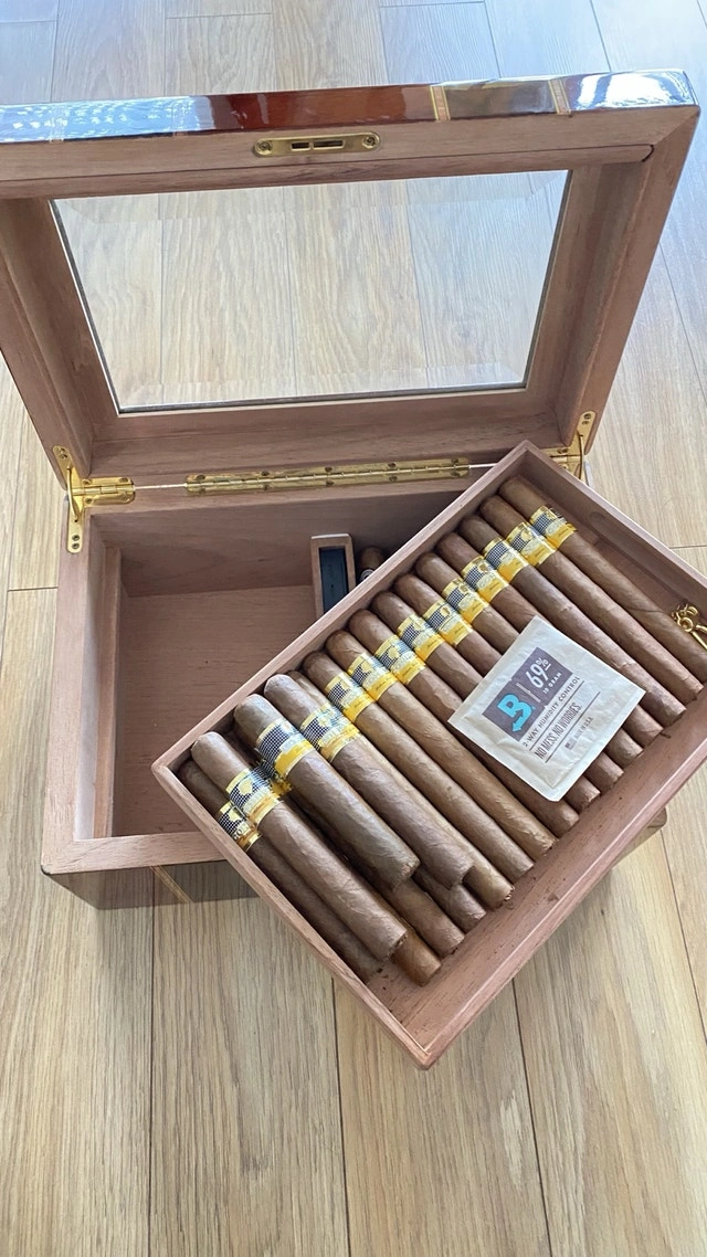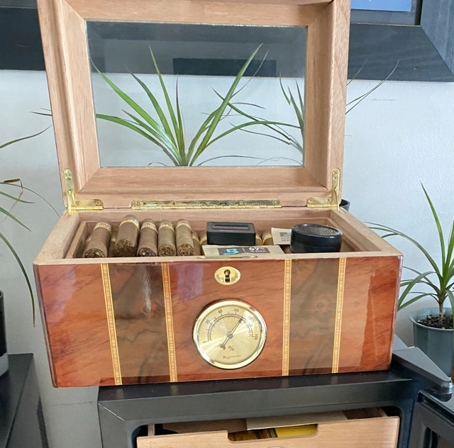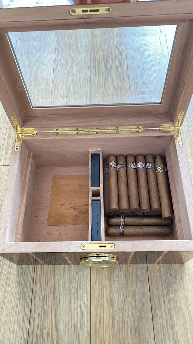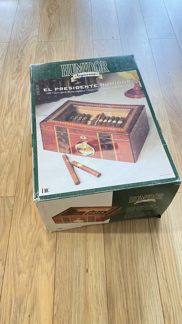 Selling my large desktop humidor. This is a 100-count box—plenty of room for a growing collection. I currently have 50 sticks in there and it’s only half full. It’s built with a high-gloss exterior and a glass display lid so you can see your collection without breaking the seal. The interior is fully lined with Spanish cedar and holds humidity perfectly. The layout is great for organization: it has a removable cedar tray and a dedicated central slot for the humidifiers to keep the airflow consistent throughout the box. The built-in analog hygrometer on the front is tested and works exactly as it should. Condition: Excellent. Well-maintained, holds a rock-solid seal, and has no scratches. I still have the original retail box for it as well. Includes: