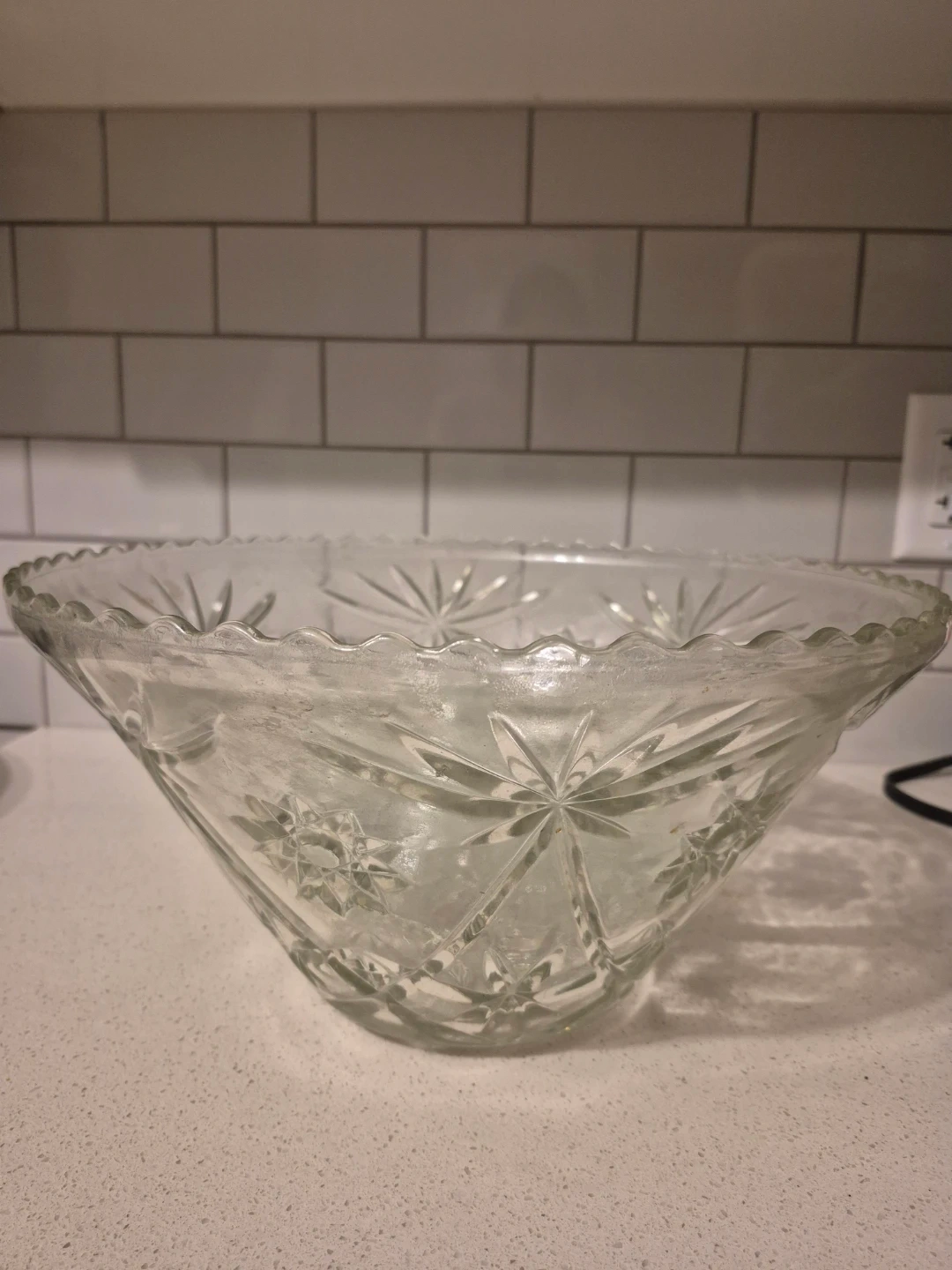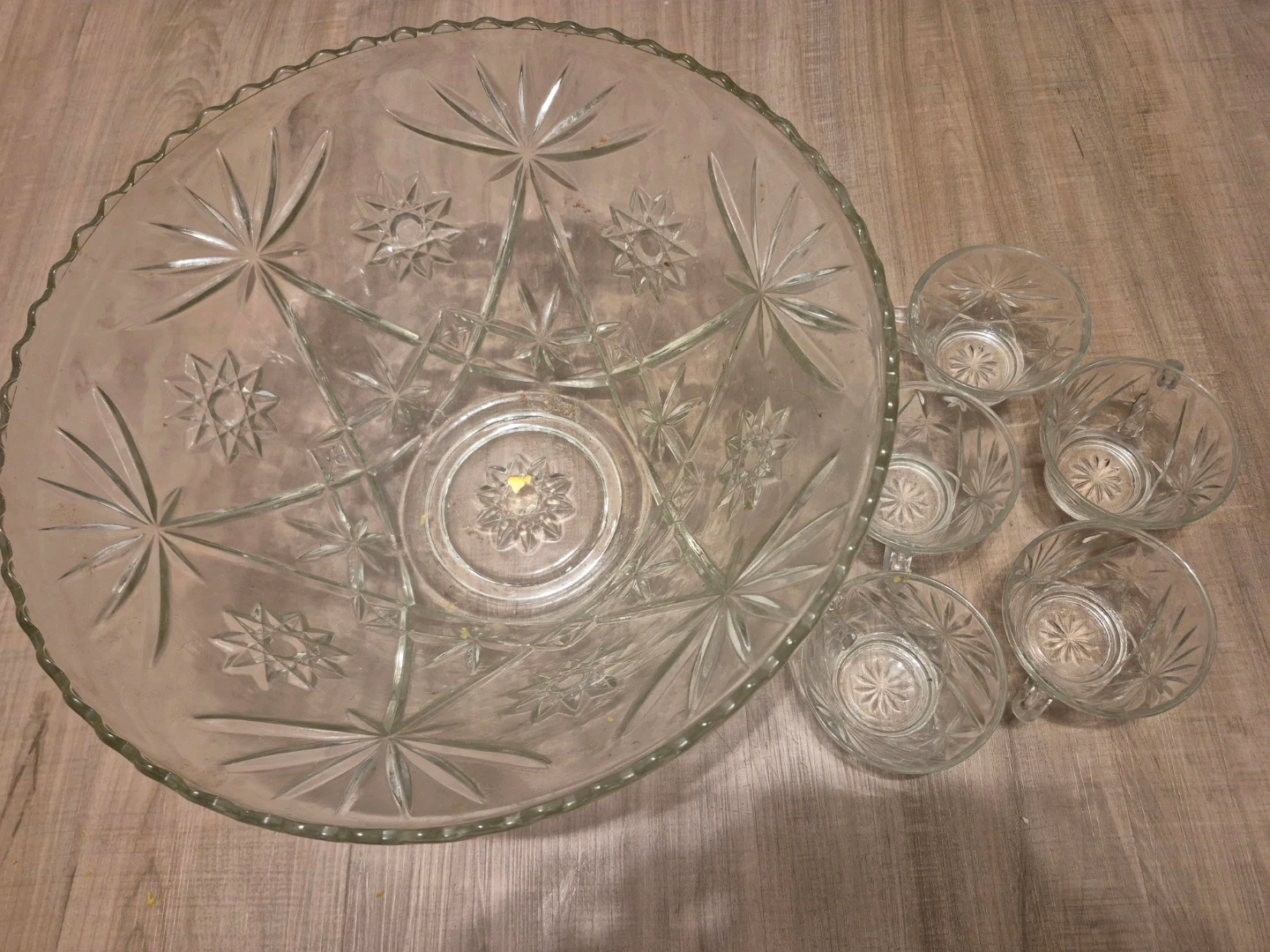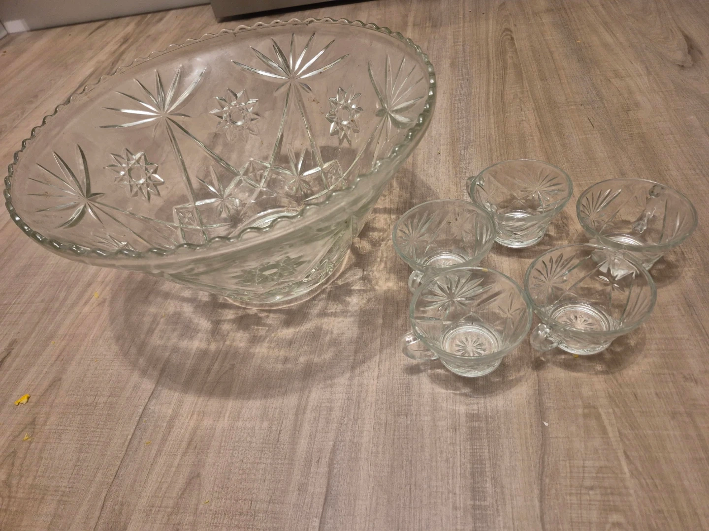 Selling a beautiful vintage punch bowl set! It comes with the large punch bowl and five matching cups. The set features a lovely starburst pattern. Perfect for parties or special occasions!