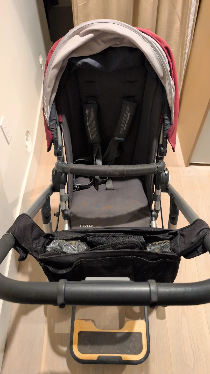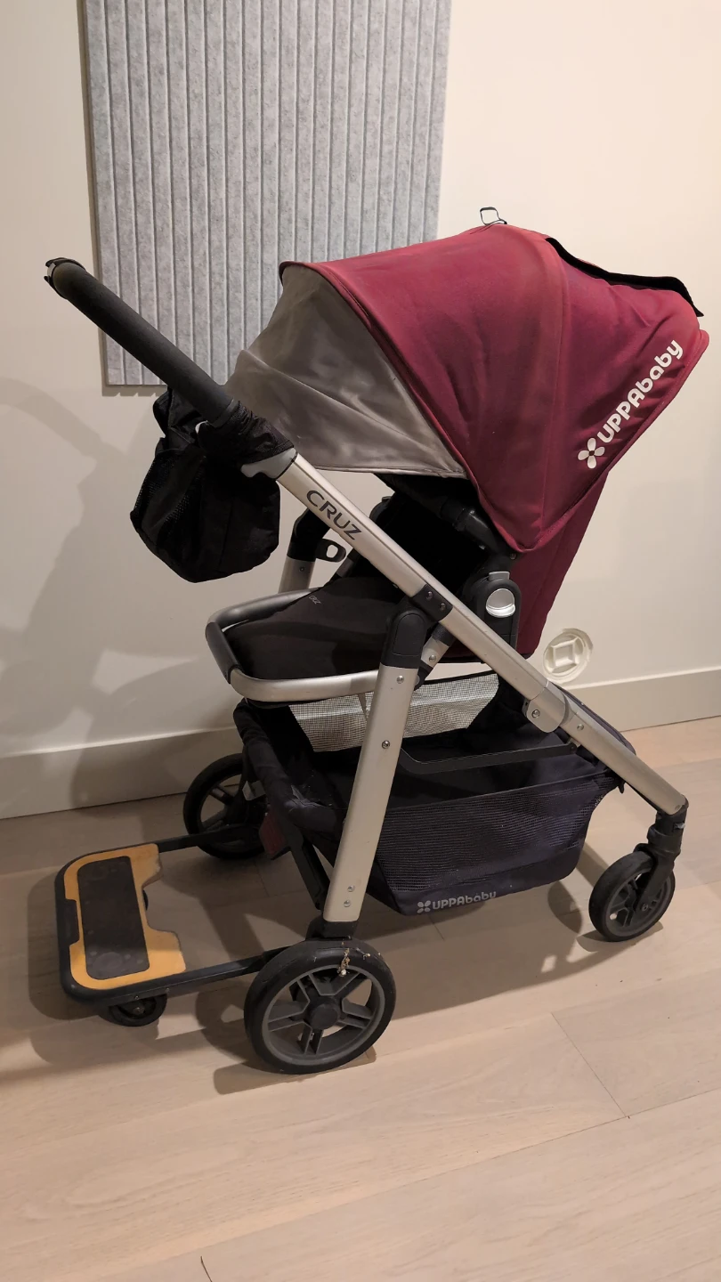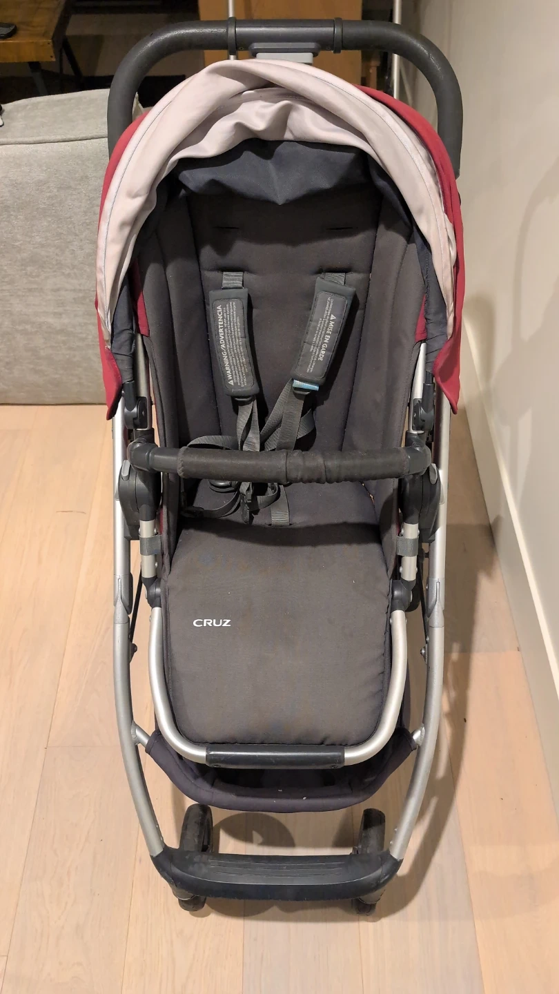 Selling a used UPPAbaby Cruz stroller with piggyback attachment! It has a grey seat and a red canopy. Perfect for getting around town with your little one. Been through 3 kids.