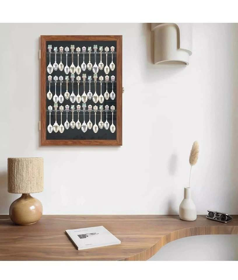36 Souvenir Tea Spoon Solid Wood Display Case Rack Cabinet with Glass Door Walnut Finish