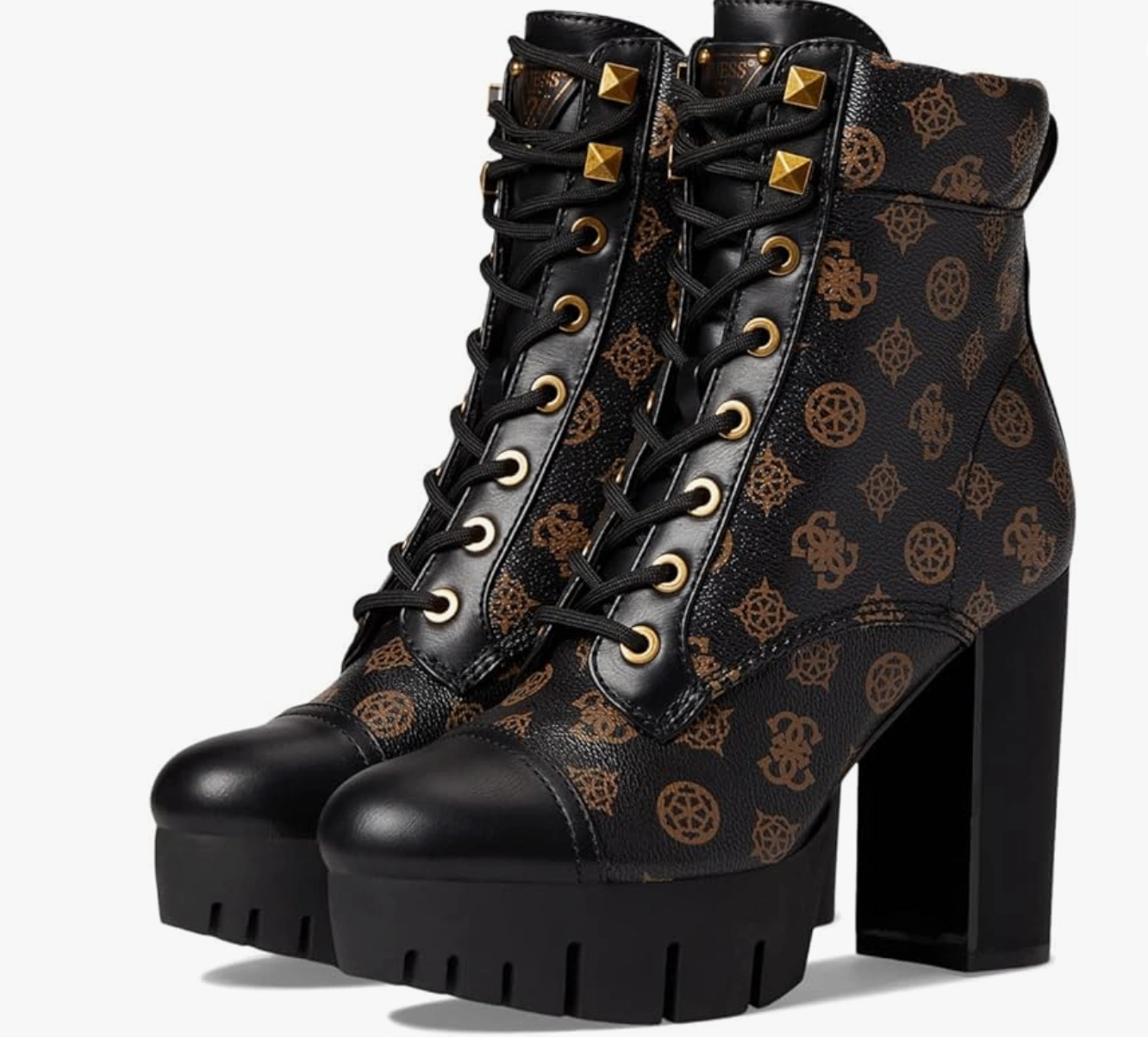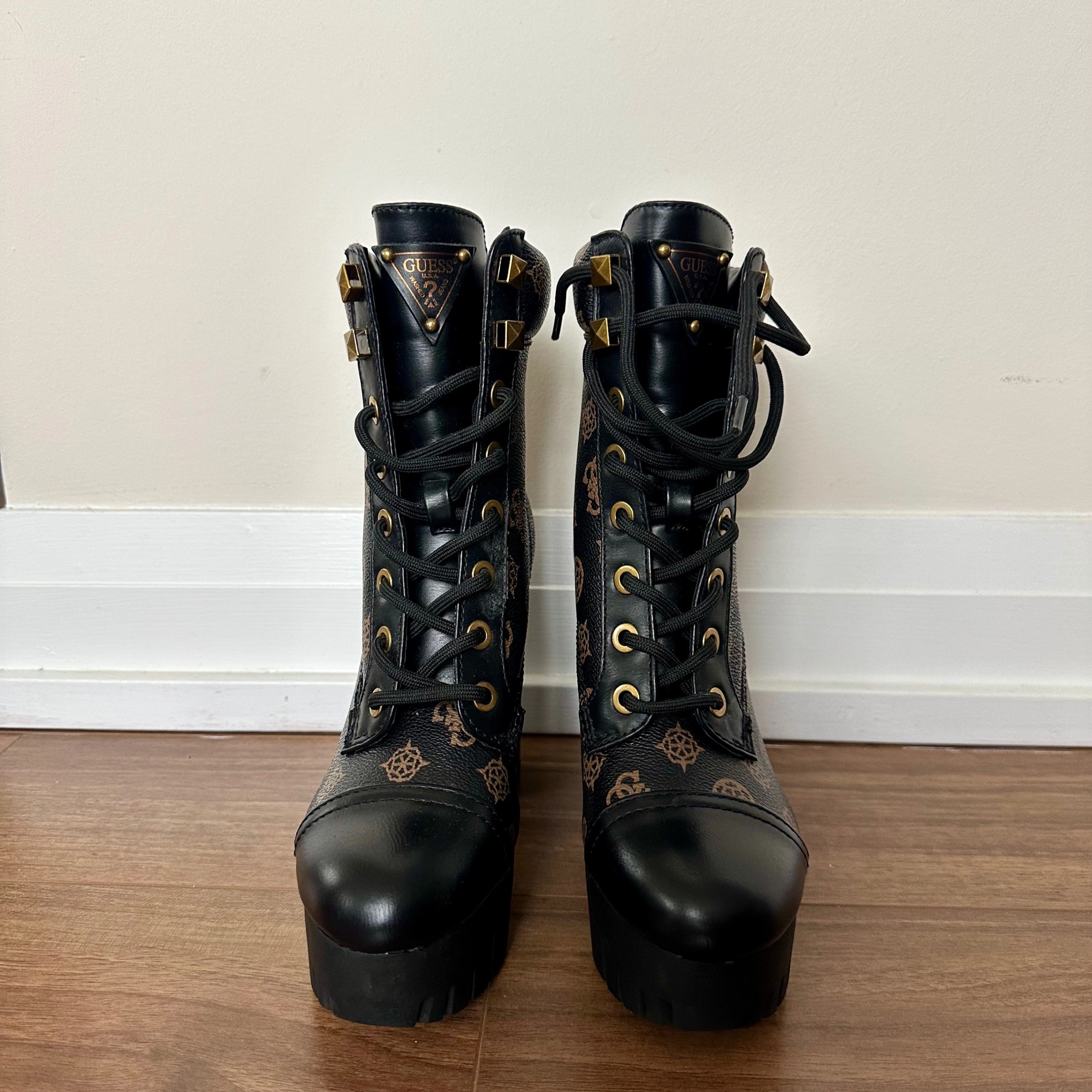 Brand new, never been worn "Geovey" style logo print lace up high heel sole booties from Guess. Size 6.5. Showcasing a black finish accented by a signature brown logo print, these boots feature a lace-up design with gold-tone eyelets and a sturdy lug sole for added traction and durability. The pull tab at the back makes them easy to slip on, while the block heel provides a comfortable lift. The overall design blends functionality with a touch of luxury, making them a standout addition to any wardrobe. Perfect for adding an edgy touch to casual outfits, stepping out for a night on the town, or elevating your everyday looks with a fashionable twist! Features: - Synthetic upper. - Synthetic lining and insole. - Round toe. - Lace-up closure.