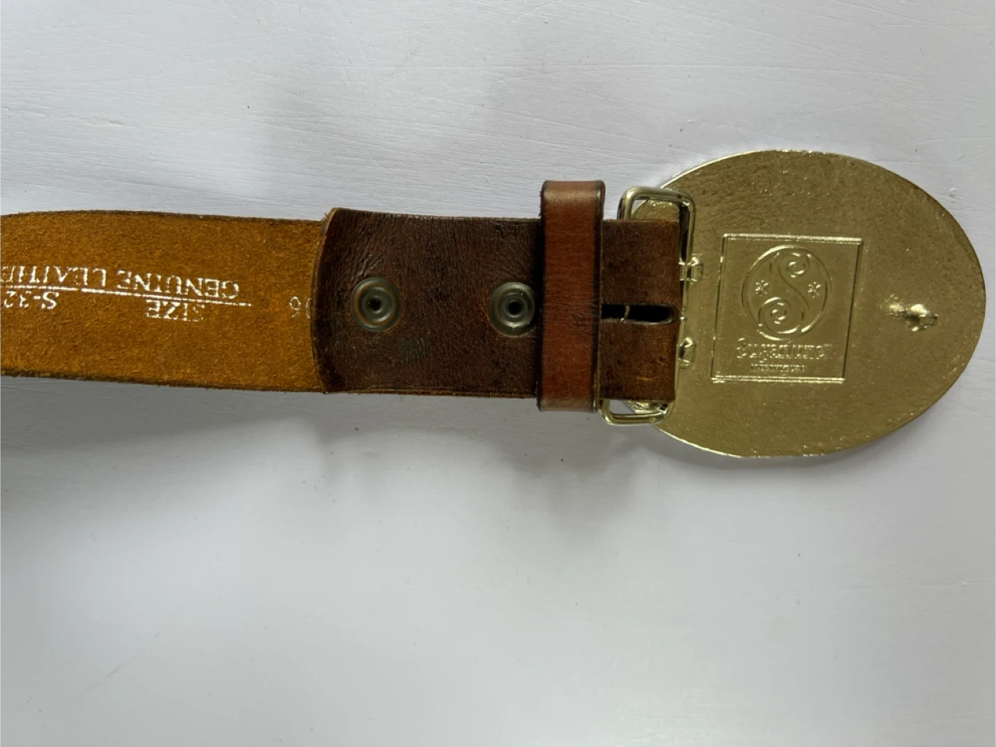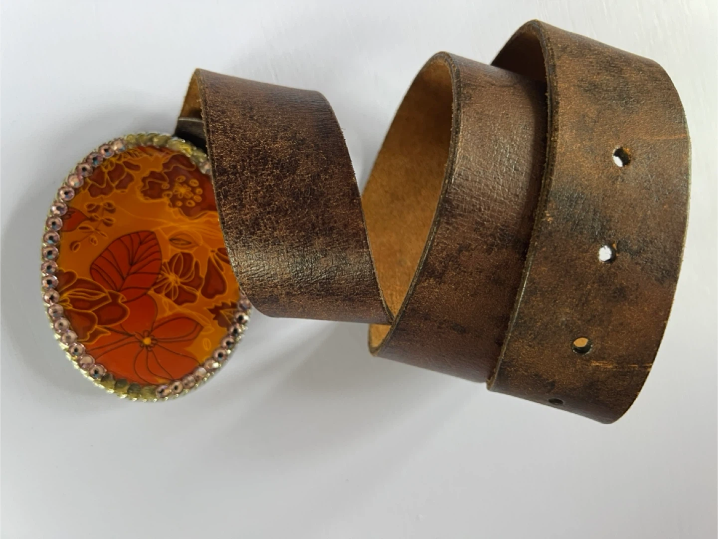 Selling a vintage Sugar Babe belt in size S-32. It features a unique floral design on the buckle with rhinestone accents. The belt is made of genuine leather.