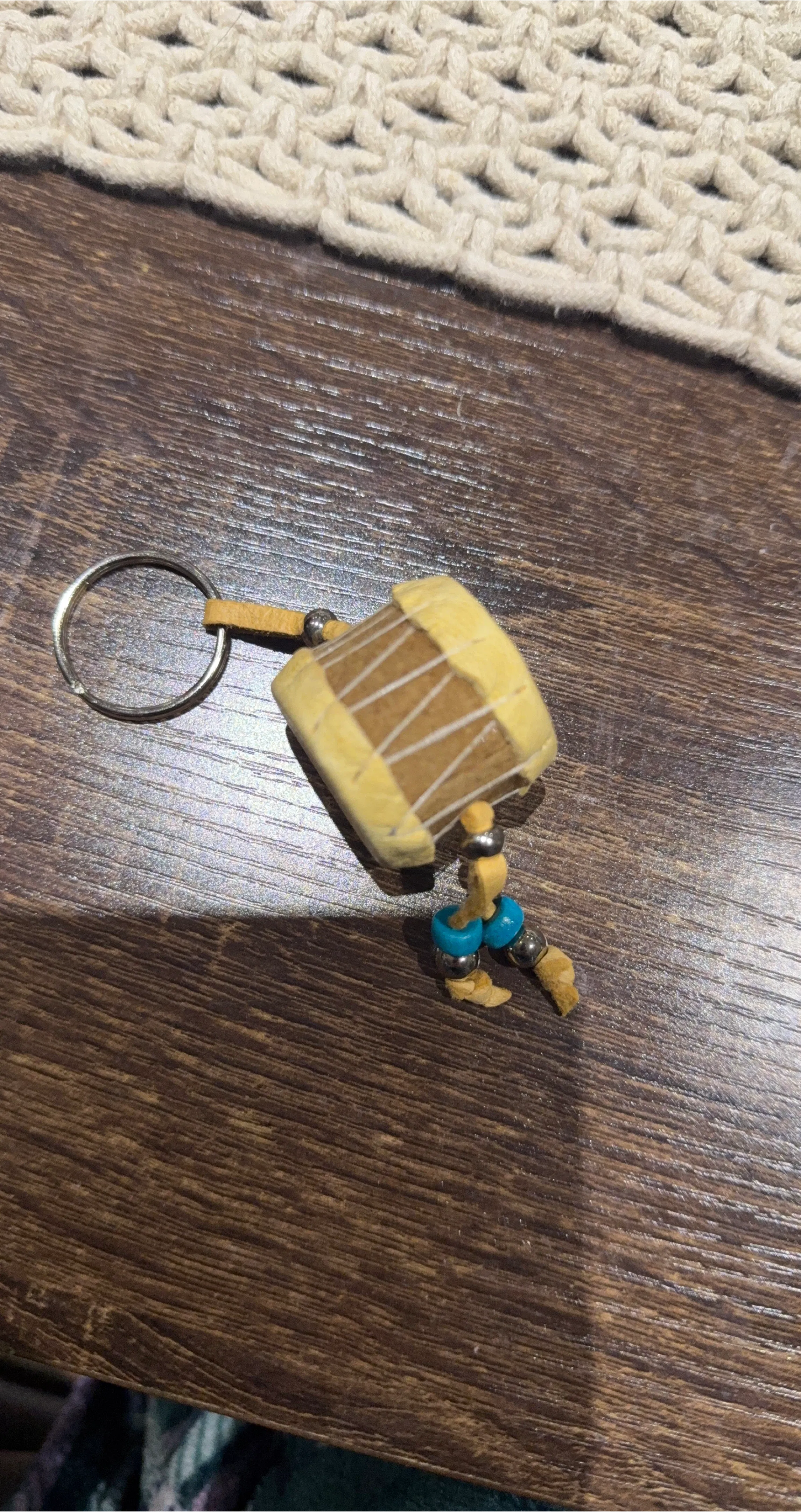 This is a handmade drum keychain. It's in great condition and has a unique design with small blue beads. Perfect for adding a little flair to your keys or bag