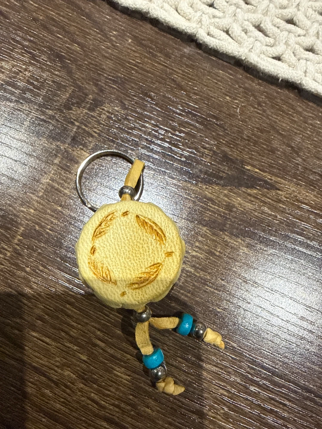 This is a handmade drum keychain. It's in great condition and has a unique design with small blue beads. Perfect for adding a little flair to your keys or bag