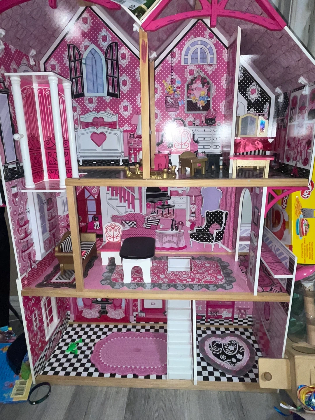 A large pink dollhouse for sale! It features multiple rooms and levels, perfect for imaginative play. The dollhouse includes furniture and accessories as pictured.