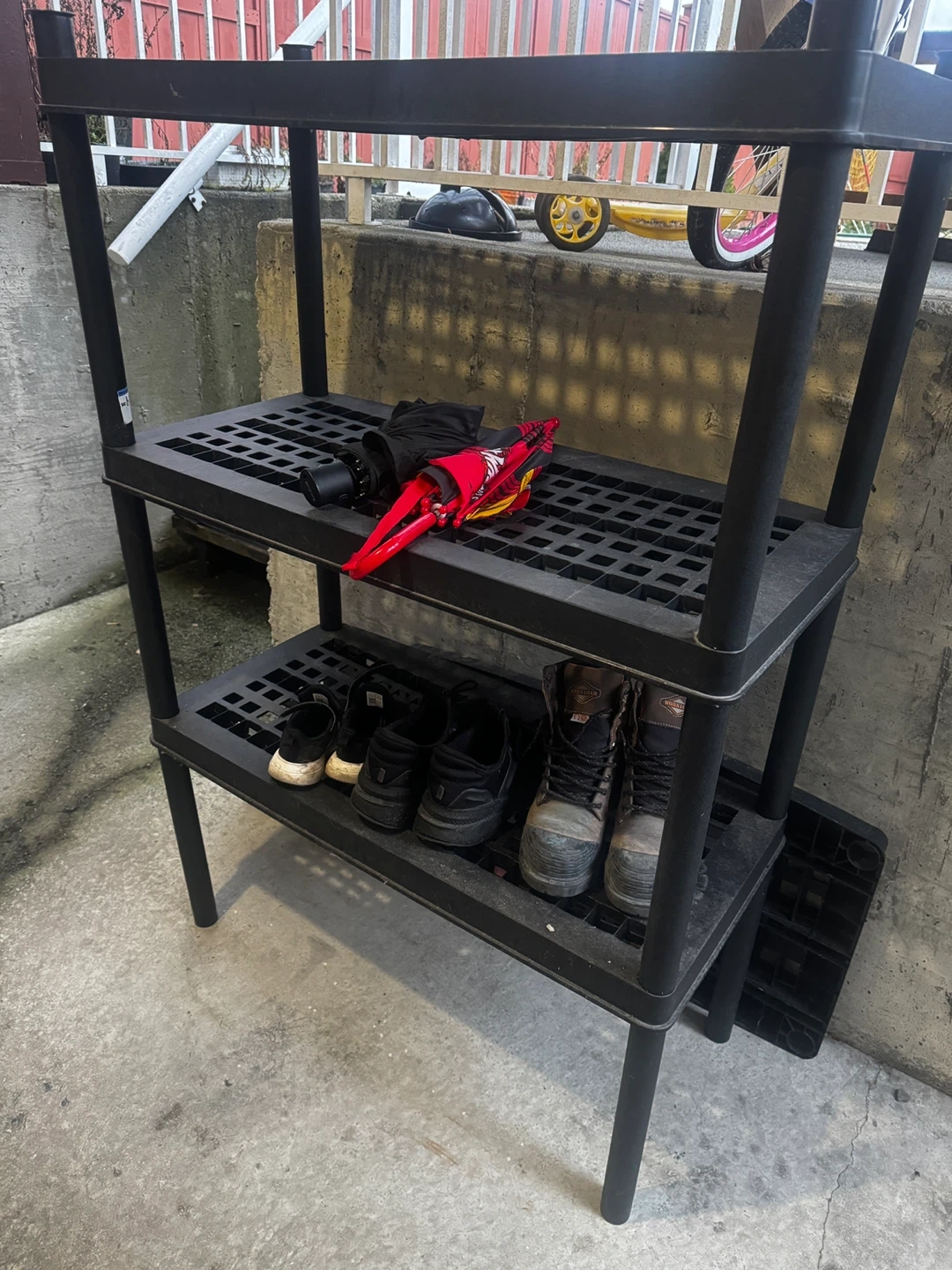 Selling a black plastic 3-tier shelf. It's in good condition and perfect for organizing shoes, umbrellas, or other items. Great for use in a garage, closet, or entryway