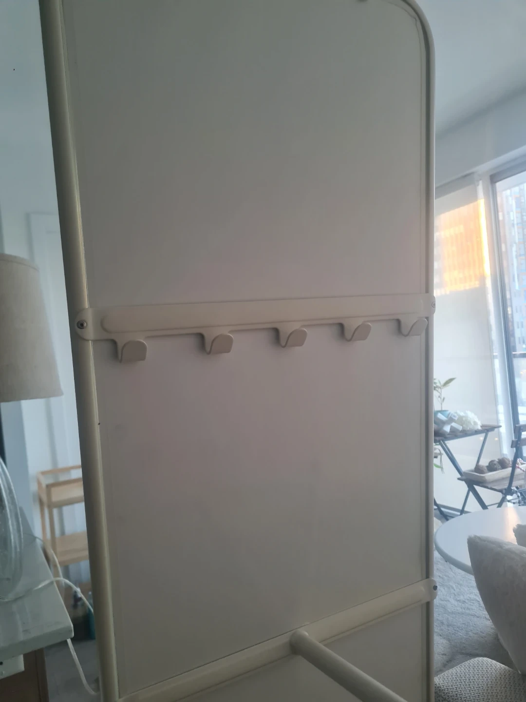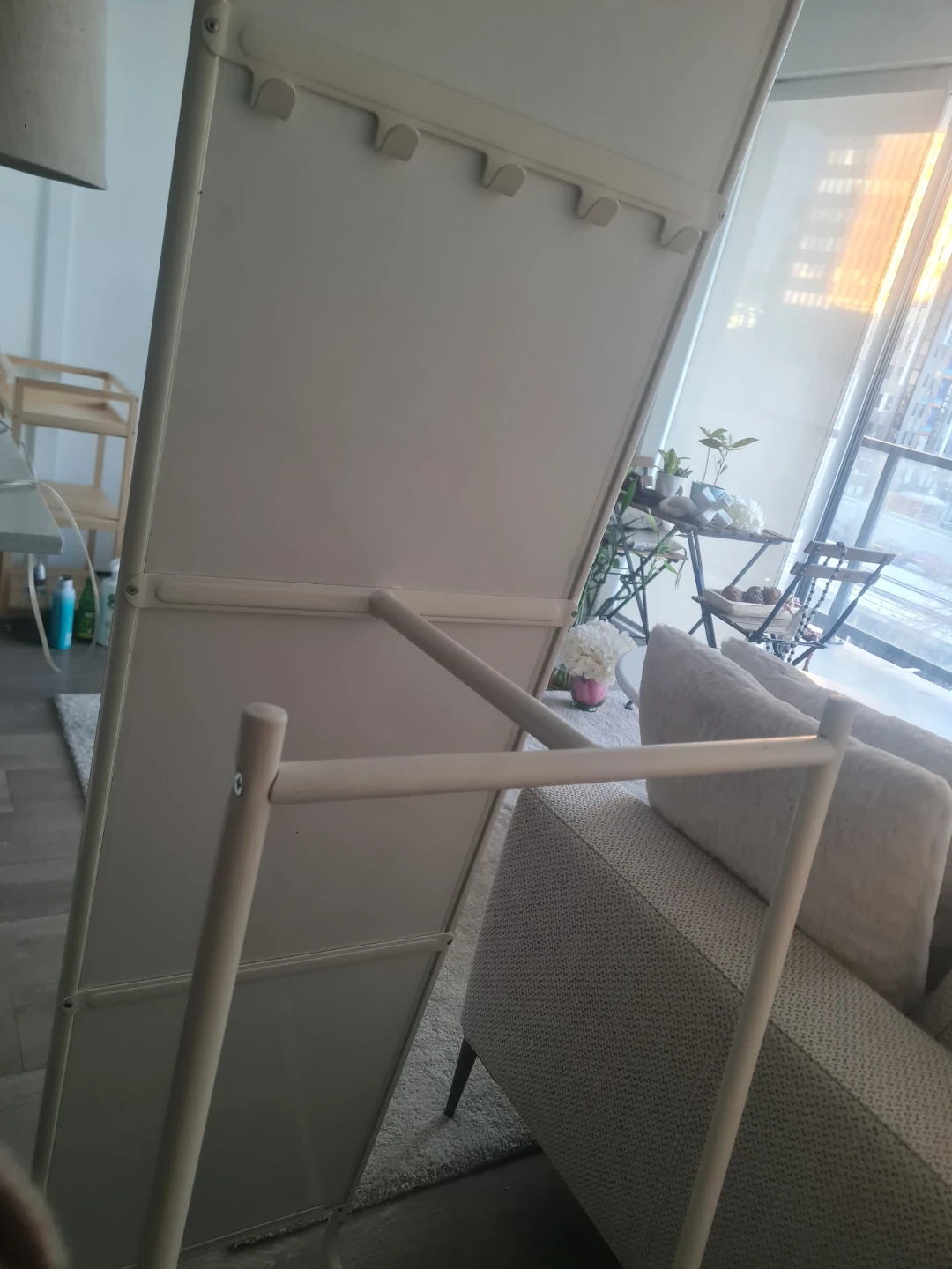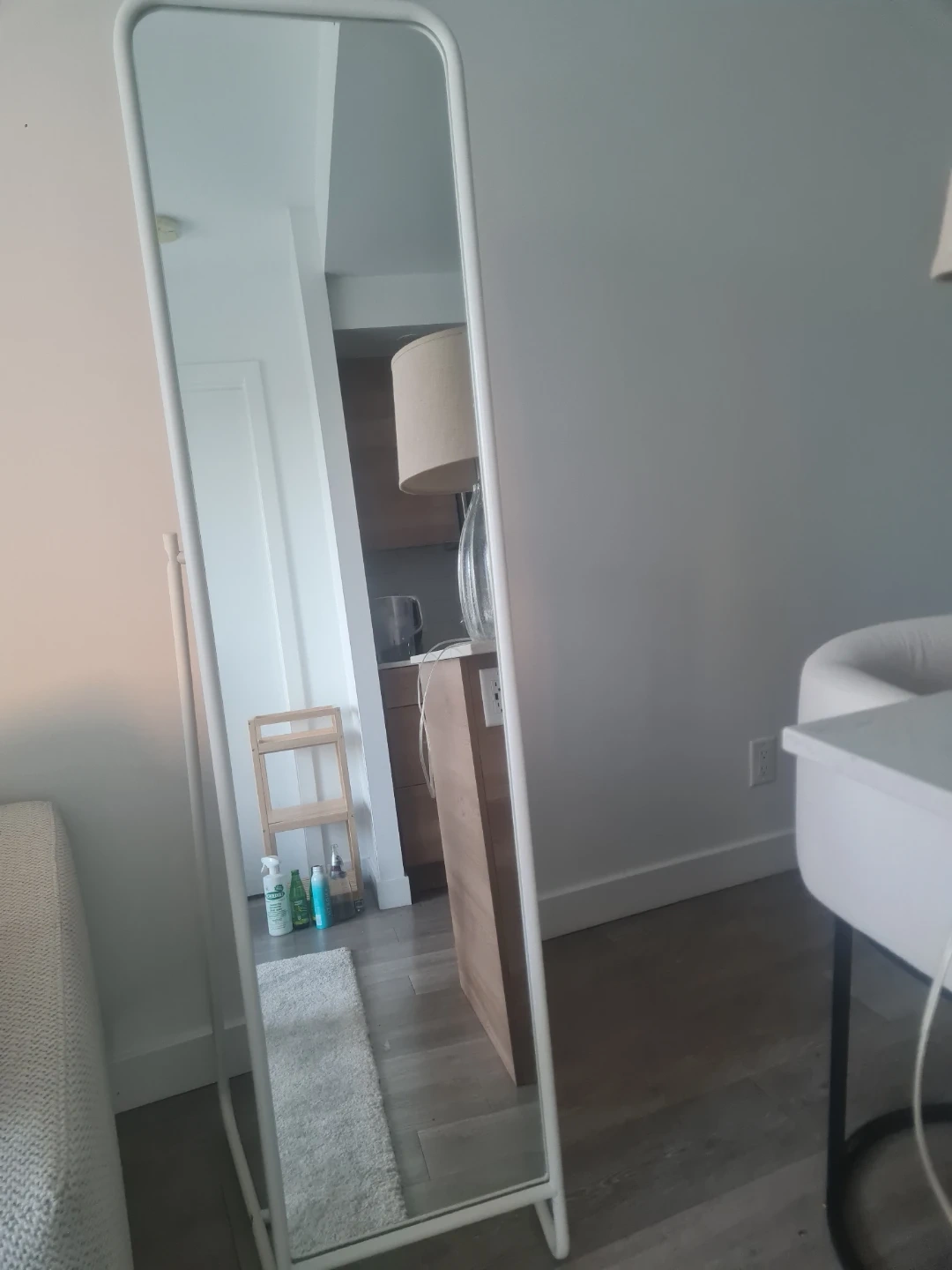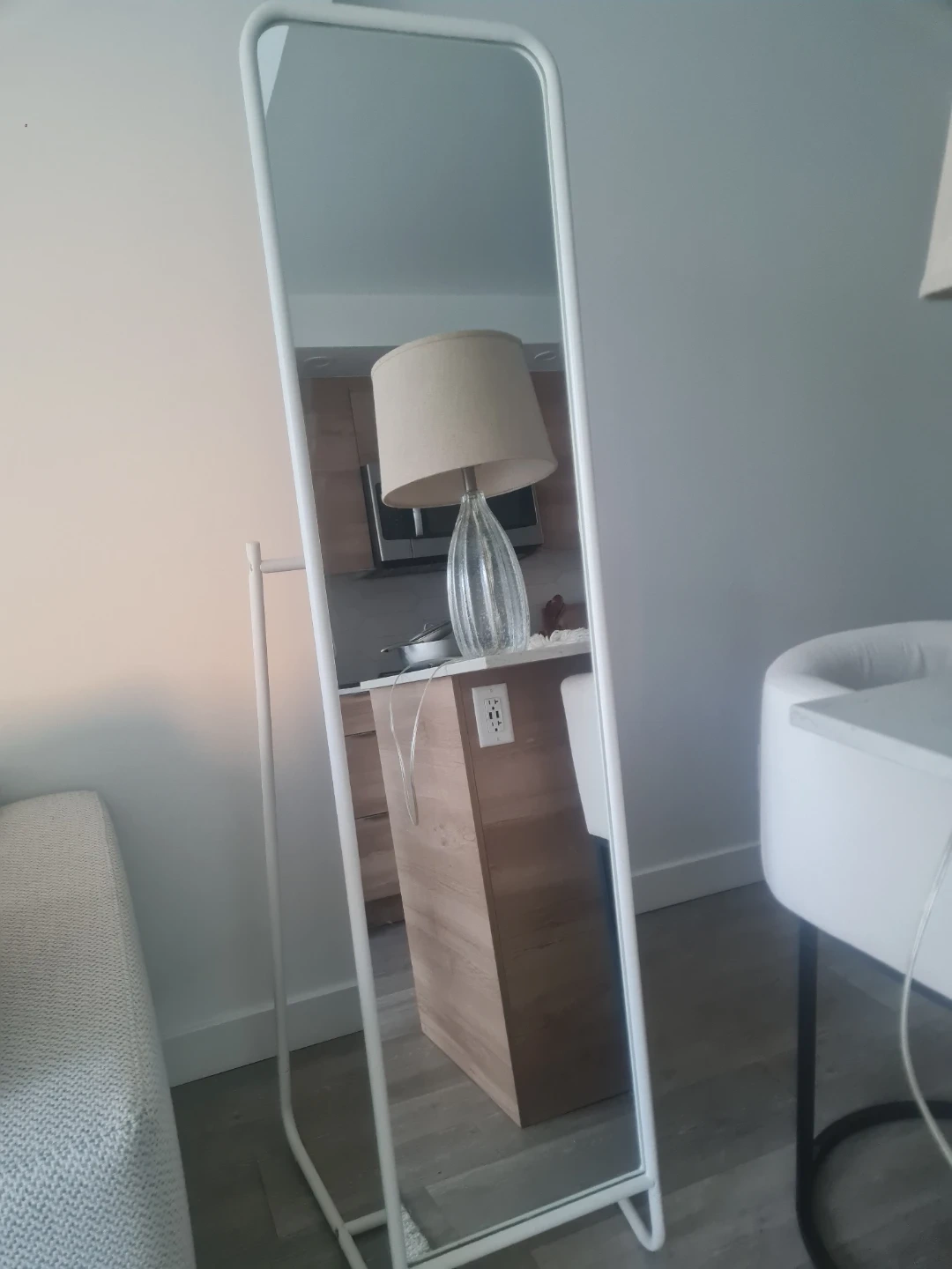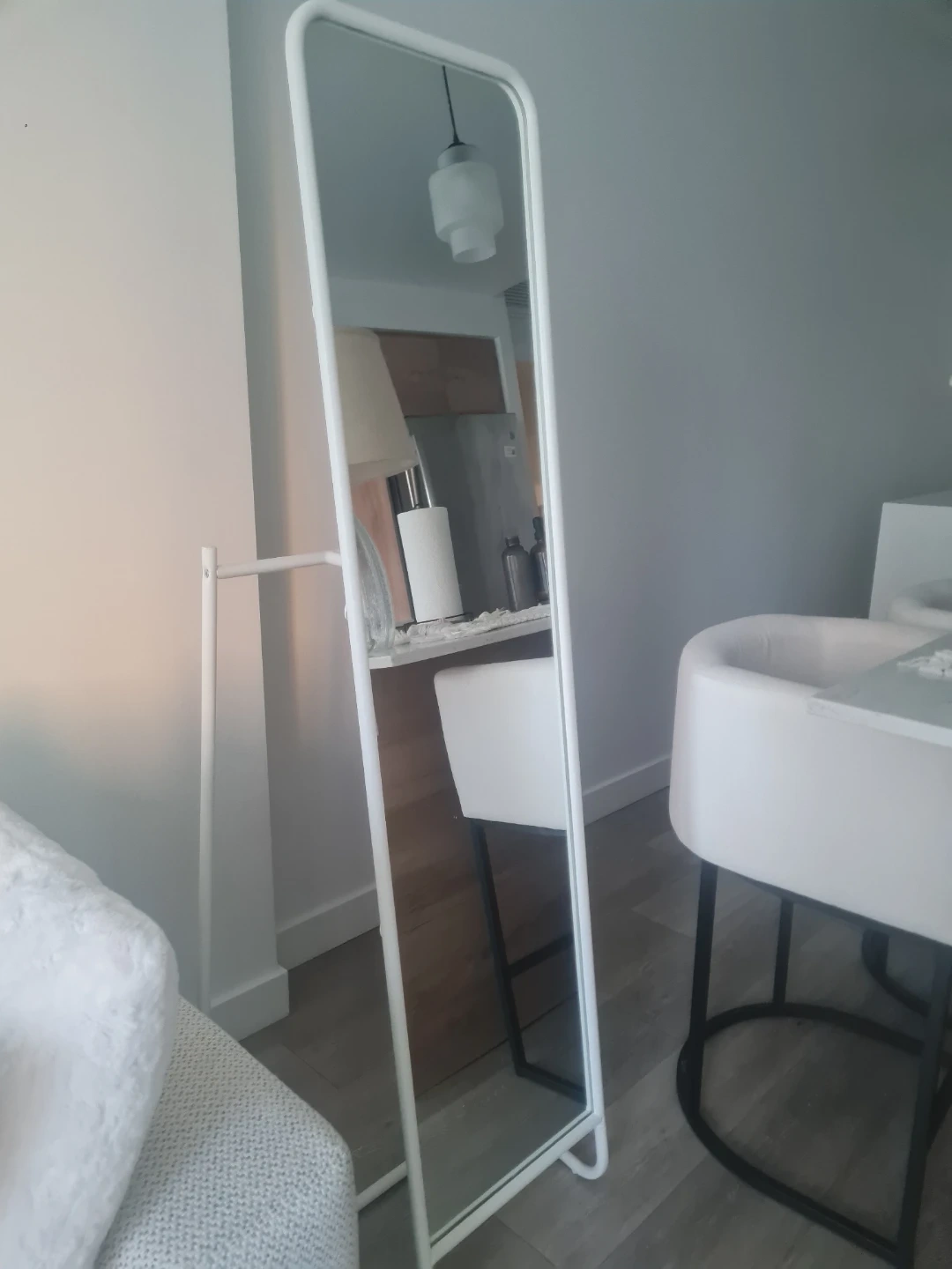 Selling an IKEA Knapper standing mirror with a built-in clothes rack. It's in great condition and perfect for adding a touch of style and functionality to any room. The mirror provides a full-length reflection, while the rack offers convenient storage for clothes and accessories
