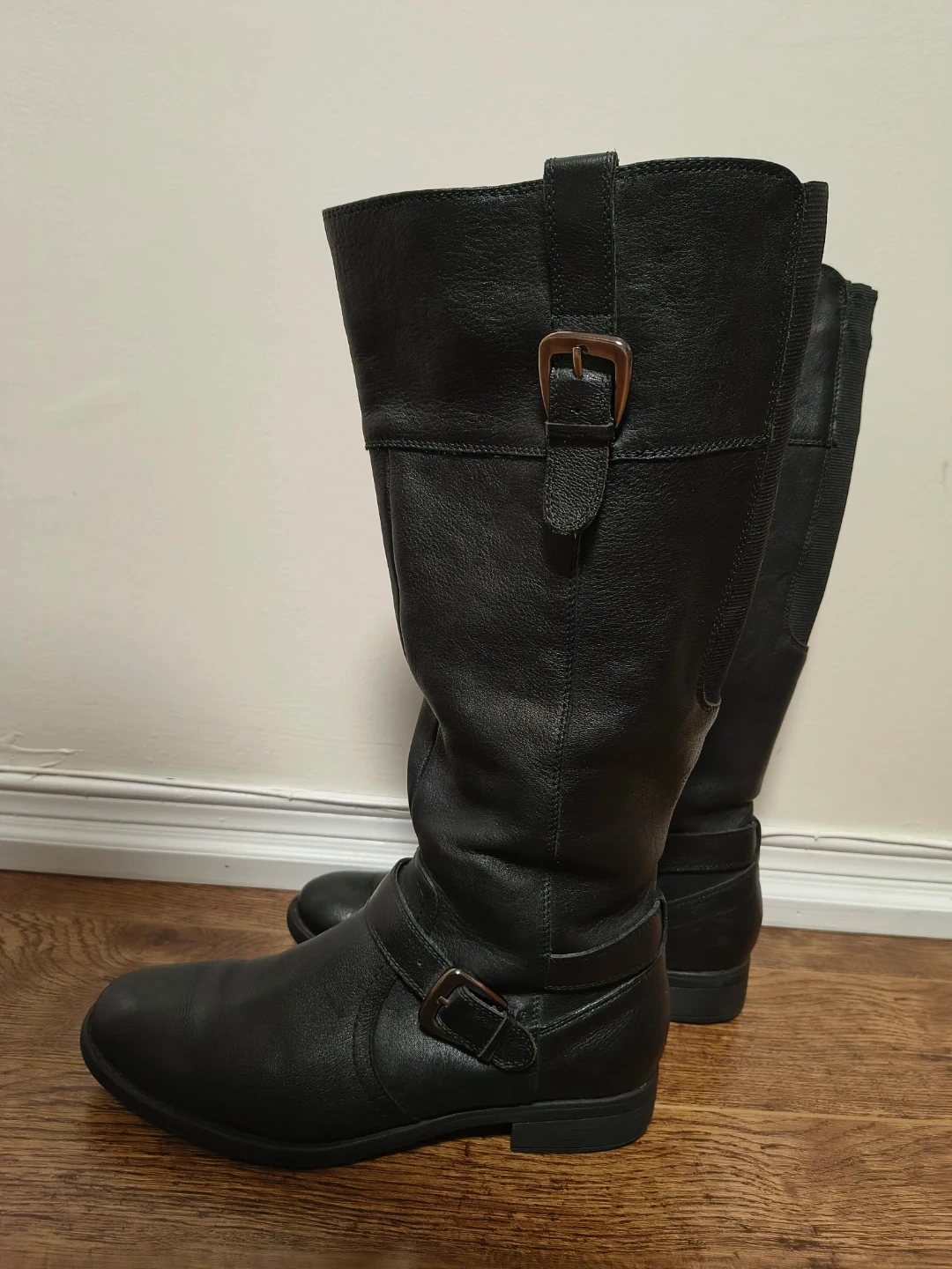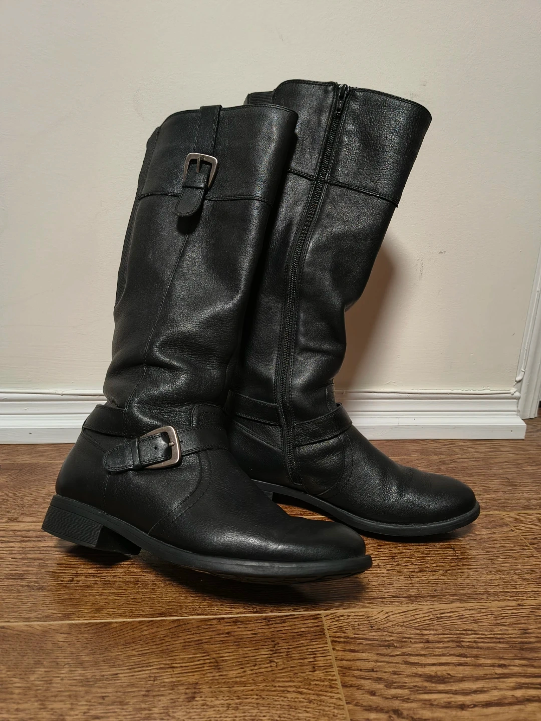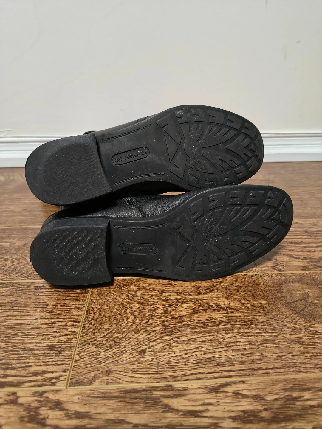 Selling a pair of Denver Hayes black leather riding boots in size 10M. They are in good condition and have a stylish buckle detail. Perfect for fall and winter!